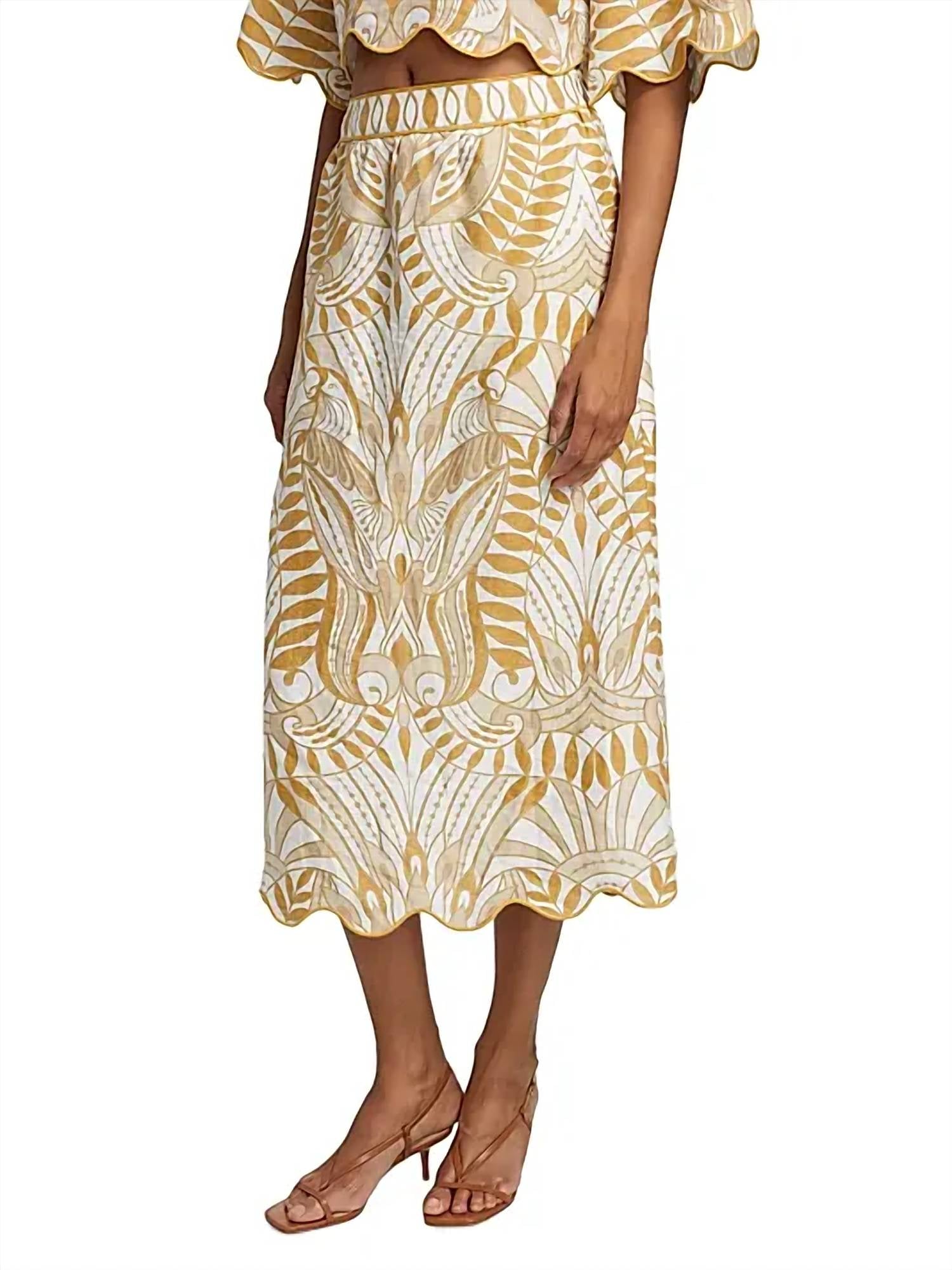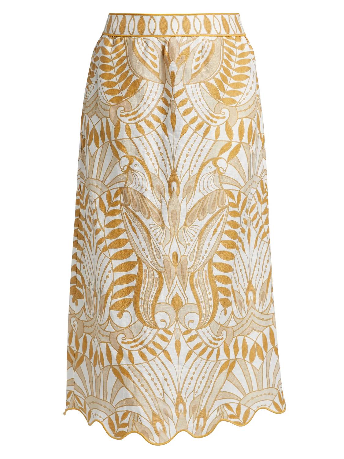 The midi length skirt is here to stay and we especially love this style. Step into boho chic, beautifully rendered in off-white and tan print. Mid-length skirt features a seamed waist, convenient side seam pockets, and a charming scalloped hem. Crafted from 100% linen. Offers a comfortable fit perfect for a beach day. Concealed side zip closure. Hand wash. Model is wearing a US size small (5’10” tall).