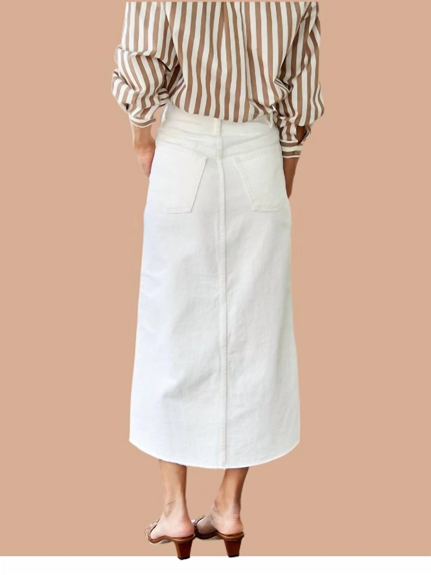 Show off just the right amount of skin in this beautifuly designed midi length skirt. Introducing the Shin-grazing Hem Midaxi Skirt by FRAME, a standout piece for your minimalist wardrobe. This ecru denim skirt is crafted from 100% premium cotton, offering a flattering fit that conforms to your figure over time. With a high-rise fit and button closure, this 34.75" long skirt is designed for effortless style. Care instructions include machine washing.