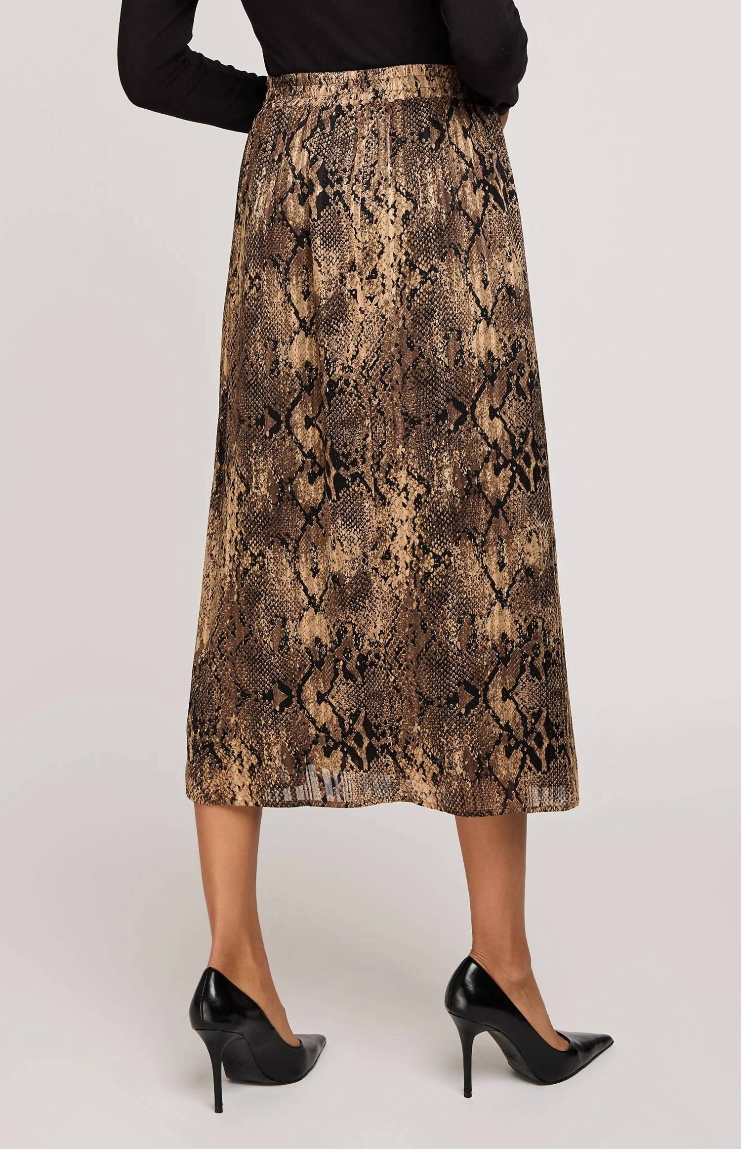 Show off just the right amount of skin in this beautifuly designed midi length skirt. Introducing the Adeline Midi Skirt by Gentle Fawn, a statement piece in the exclusive Topaz Snake print. This elegant skirt features a pleated front waist detail, side slit, and an elasticated back waistband, all crafted from lightweight lurex stripe chiffon. The pull-on design ensures ease and comfort, while the fully lined structure adds modesty and sophistication. Made from polyester, this piece requires hand washing and line drying, perfect for those looking to add a touch of quiet luxury to their fall wardrobe, especially for evening events.