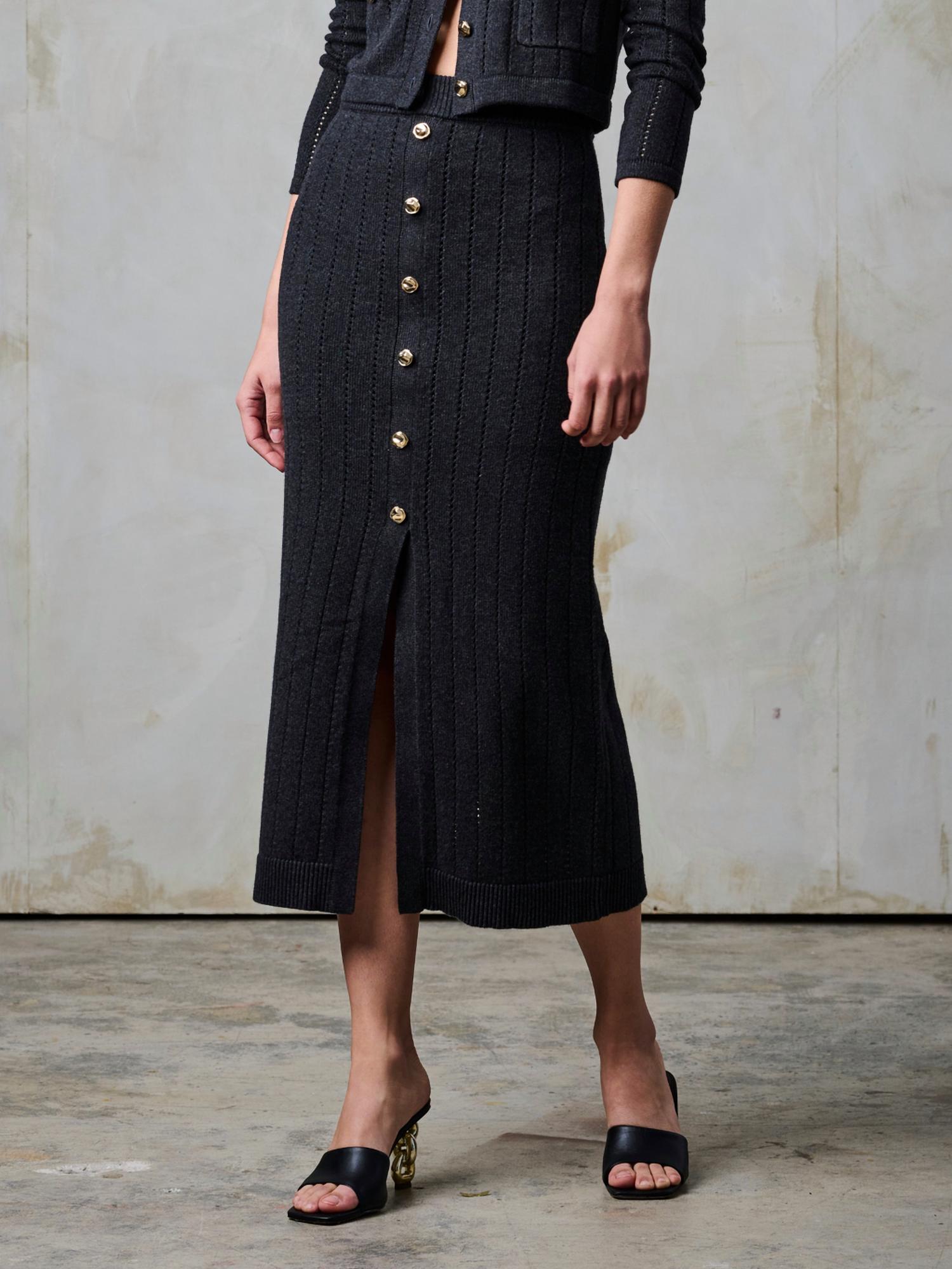 The midi length skirt is here to stay and we especially love this style. Introducing the Women's Mia Skirt by Hevron, a textured monochrome delight in a sophisticated charcoal shade. Crafted from durable cotton, this midi-length skirt is perfect for a summer vacation, showcasing a sleek pull-on design without pockets. Originating from an undefined location, it brings a simplistic elegance to your wardrobe. Care instructions specify a cold machine wash to maintain its vibrant texture and color. 95% cotton, 5% cashmere