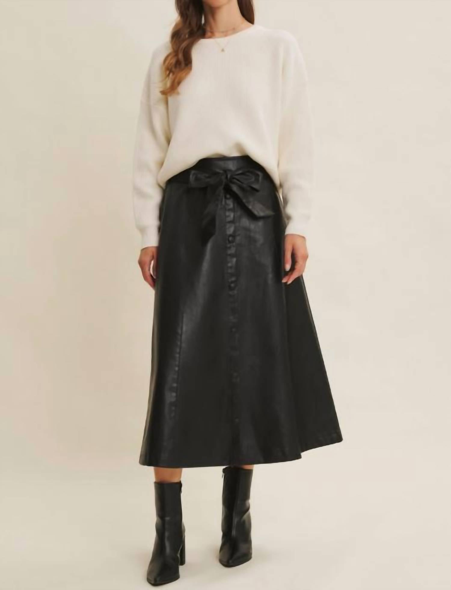 Show off just the right amount of skin in this beautifuly designed midi length skirt. Introducing the Liv Midi Skirt by In February, a standout piece perfect for travel or New Year's Eve celebrations. This mid-length skirt is crafted in vegan-friendly faux leather for a chic, solid look. Designed with a flattering belted waist and a gently structured A-line silhouette, this skirt is a blend of comfort and sophistication. Closure: Pull on, ensuring ease of movement and effortless style.