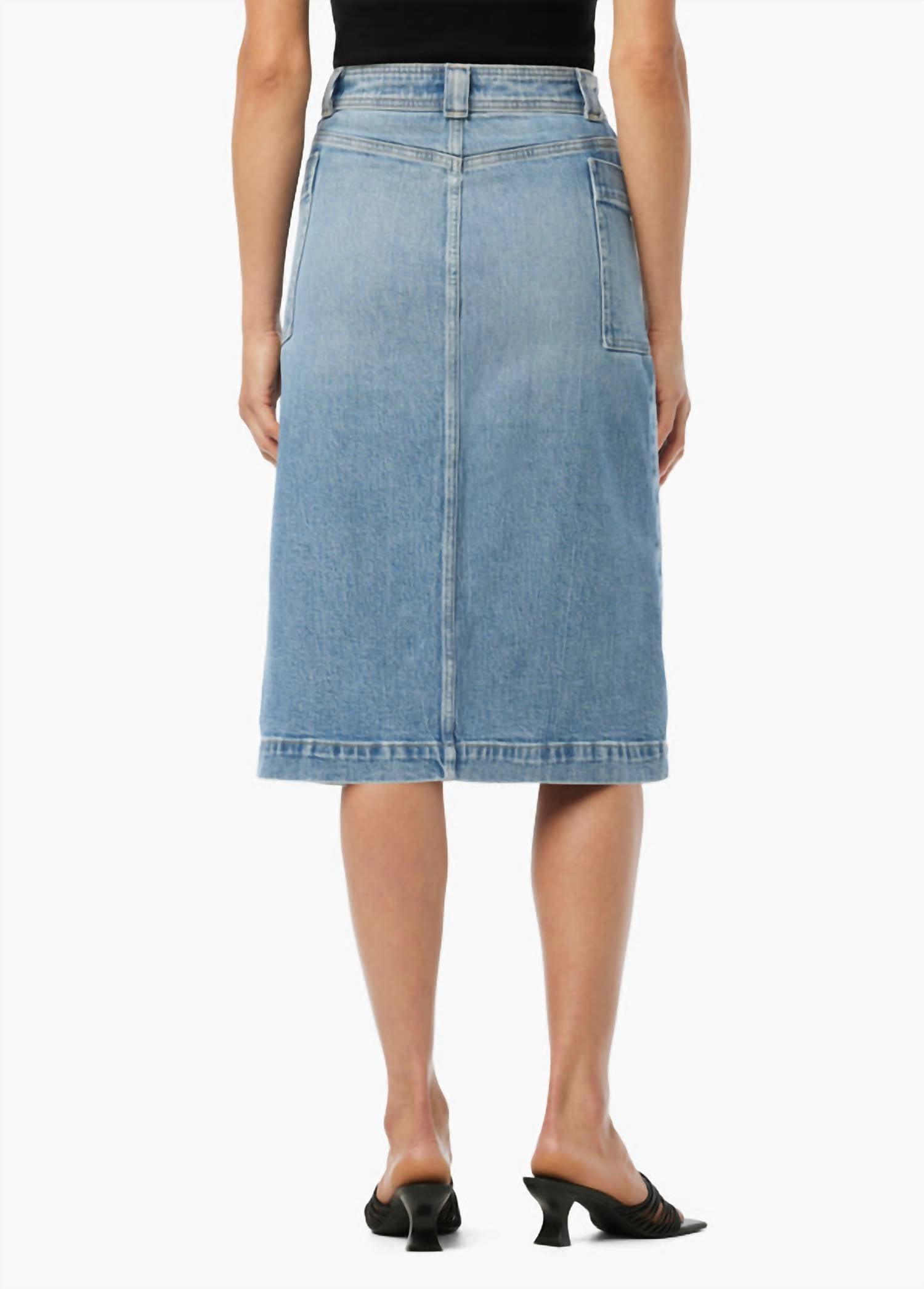 Tuck your favorite tee into this midi length skirt for an effortlessly cool look. Introducing the Phoebe Patch Pocket Skirt by Joe's Jeans, a stylish piece perfect for your summer wardrobe. This midi skirt, crafted from a comfortable cotton blend, features a button closure and angled patch pockets, offering both functionality and a nod to 90s fashion. Designed in the "So Special" color, its 27.75-inch length and environmentally-friendly production make it a conscientious choice. Though specific care instructions are not provided, its solid pattern and vacation-ready style ensure it's a versatile addition to any warm-weather ensemble.
