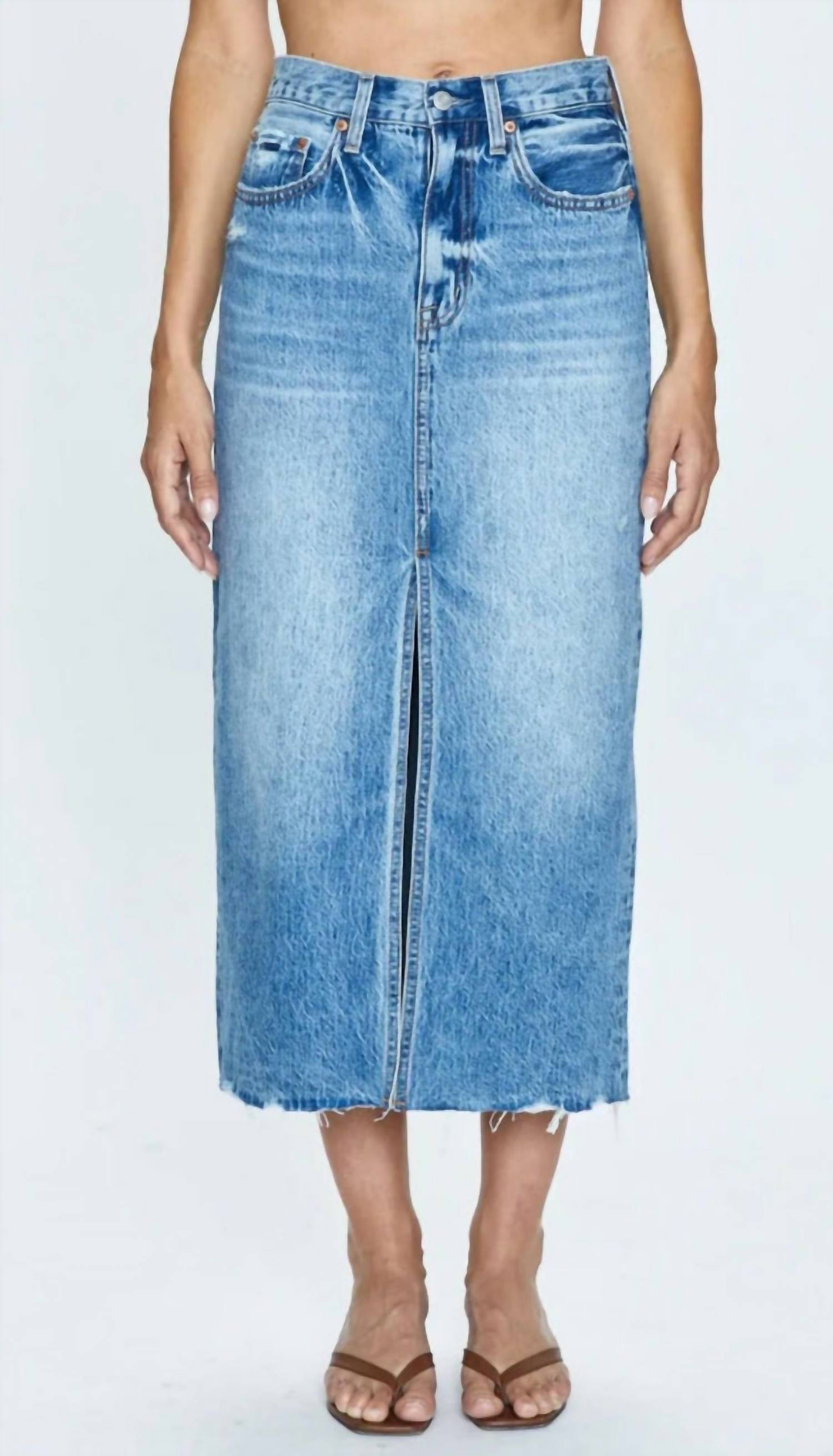 Tuck your favorite tee into this midi length skirt for an effortlessly cool look. Meet the Alice Midi Skirt by PISTOLA, a statement piece in Portrait Vintage, designed with an elongated midi length for sophistication and style. This skirt is crafted from 100% cotton rigid denim, offering a classic medium blue wash with vintage-inspired fading and whiskering. Its thoughtful design features a five-pocket layout and a scissor-cut hem, complemented by a convenient front slit for ease of movement. Closure: Zip closure. Care: Machine wash cold, tumble dry. Length: 37 inches.