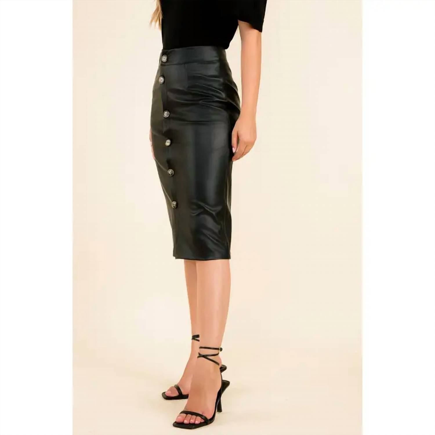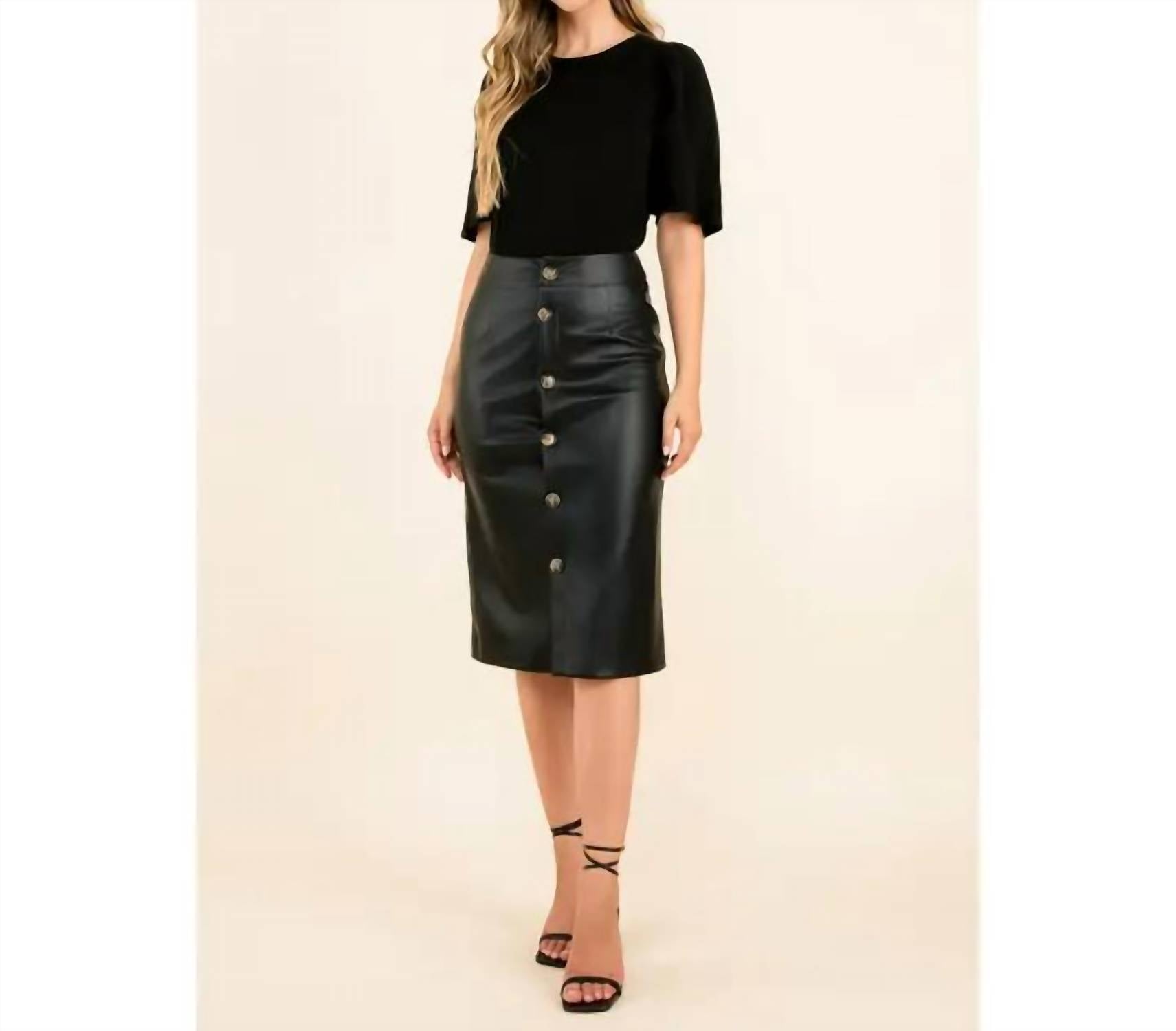 Show off just the right amount of skin in this beautifuly designed midi length skirt. Faux Leather Button Front Midi Skirt . / Style Measurements for Size S / Designed in USA - Body Length: 54 1/4 in - Waist Width: 26 in - Bottom Opening: N/A . / Model Sizes - Wearing Size S - Height 5' 9", Bust 32", Waist 25 1/2", Hips 36" .  Fabric Content - WOVEN / 50% Polyester, 50% Polyurethane