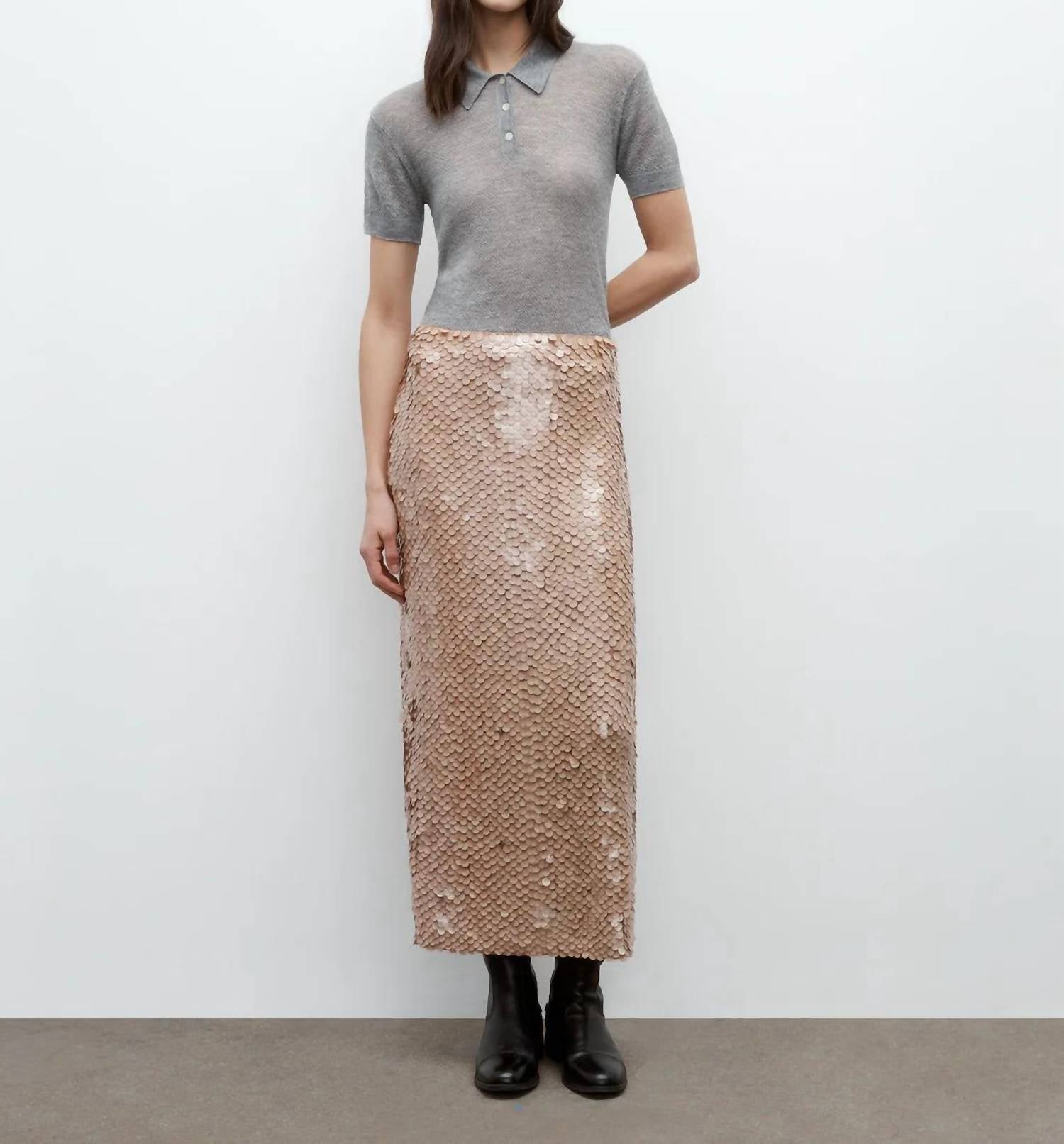 Show off just the right amount of skin in this beautifuly designed midi length skirt. Elevate your spring cocktail party wardrobe with the Gwyneth Paillette Skirt by TWP, designed for women who appreciate textured elegance. This nude midi slip skirt, crafted with a mid-rise fit, is adorned with circular paillettes on a mesh backing, and features a stylish side slit for added flair. Closure: Concealed zip closure. Perfect for any sophisticated occasion.