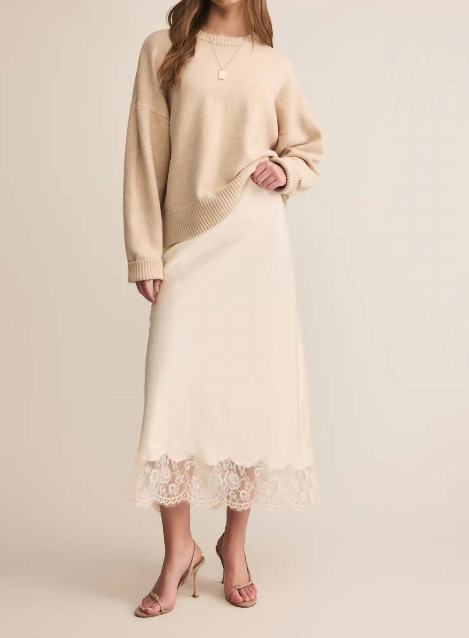 Show off just the right amount of skin in this beautifuly designed midi length skirt. Luxe satin and delicate lace come together in this midi skirt that instantly elevates your look.