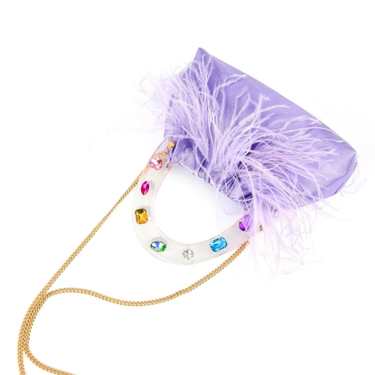 Now trending: Mini bags! Introducing the Women's Colorful Gem Handle Embellished Feather Bag by Milanblocks, a stunning accessory in light purple eco-satin. This eco-friendly bag boasts a striking acrylic gemstone embellished handle, combining luxury with sustainability by containing at least 50% certified eco-materials. Its compact design measures 4" in depth, 7" in width, and 5" in height, with a handle measuring 3.5". Perfect for making a true statement, this mini bag seamlessly blends style and environmental consciousness.