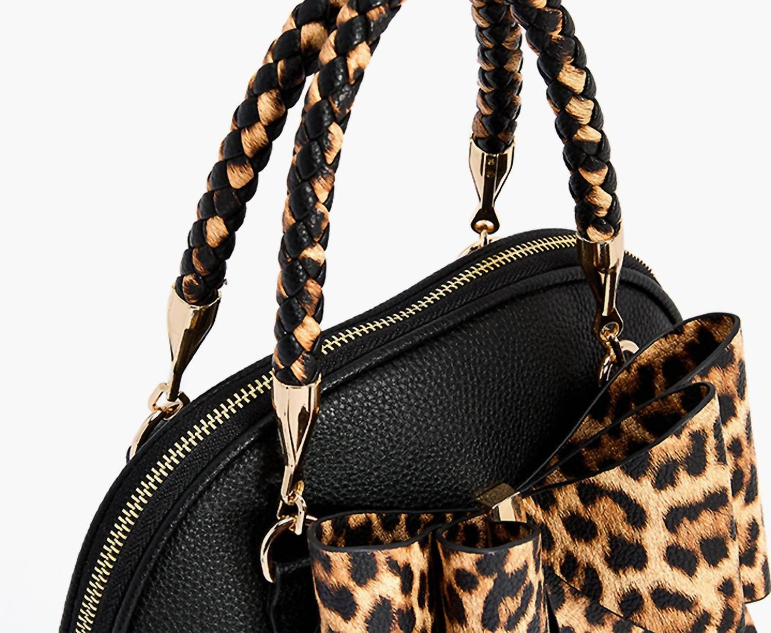 Small in size but a total statement maker. Effortlessly combines style and function. Crafted from premium saffiano vegan leather. Chic handbag sports a signature double bowtie design in a striking leopard print. Features a sturdy braided top handle, double top handles, and exquisite gold hardware detailing. Inside, an elegant leopard print polyester lining and an inner slip pocket offer chic organization, while its dimensions of 10"W x 7.5"H x 5"D add to its compact charm.