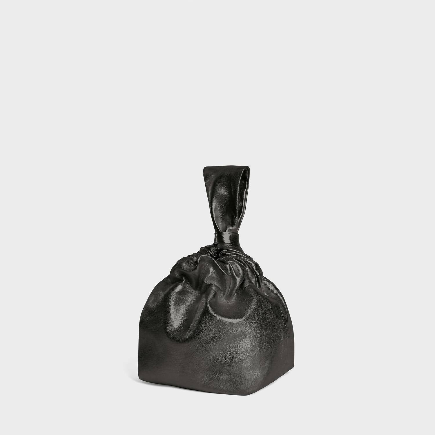Small in size but a total statement maker. Introducing the Women's Mariposa Twist Clutch Handbag by Lemiz in a striking silver hue, handcrafted from supple Italian lamb leather. Thoughtfully designed with a wristlet strap, this clutch ensures hands-free convenience, making it an ideal travel companion. Its soft silhouette is complemented by a cotton canvas lining and an inside pocket for organization, comfortably fitting an iPhone Max. Handcrafted in Los Angeles, this mini bag has dimensions of 6.5" width, 6.5" depth, and 7" height, perfect for carrying your essentials.