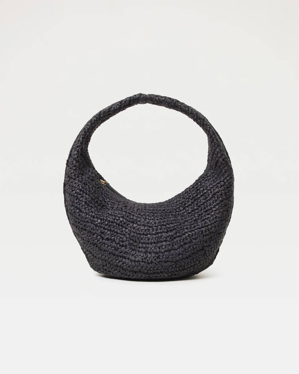 Small in size but a total statement maker. The Women's Aya Bag by L*SPACE in Stripe is a chic mini bag with a unique slouchy, moon-shaped silhouette. Crafted from woven paper raffia, this fully-lined circle bag is both eco-friendly and stylish. It features a secure zipper closure to keep your essentials safe. With dimensions of 14.17" width, 7" height, and 3.15" depth, it is designed for compact convenience.