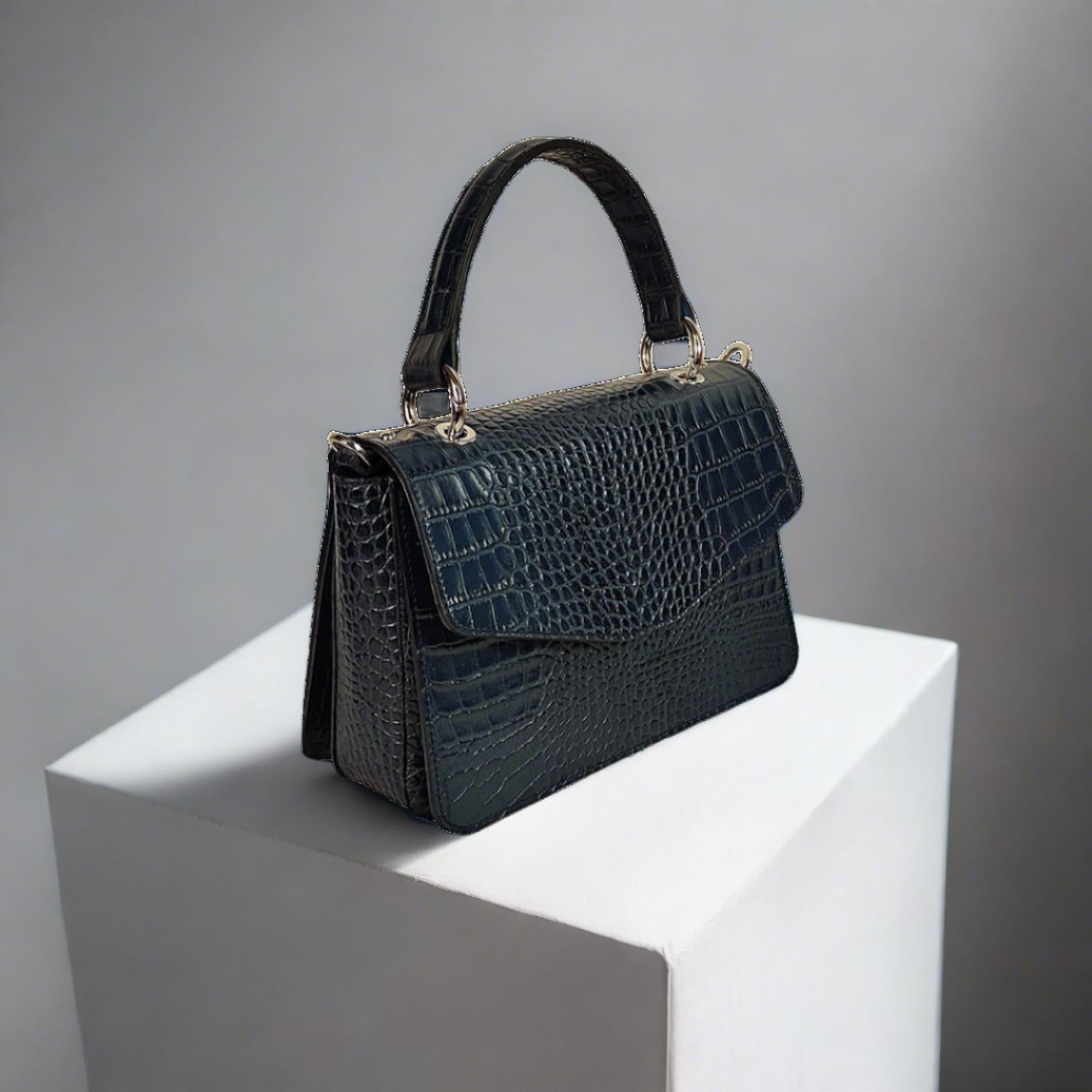 Small in size but a total statement maker. Embrace timeless elegance with the Women's Terra Handbag by Bergè, crafted from crocodile-printed Italian leather, a true symbol of luxury and sophistication. This exquisite mini bag in Petrol Blue features a practical snap closure and boasts a compact interior with one zip pocket and two slip pockets. Measuring 9.5" in length, 7" in height, and 4" in depth, it comes with an adjustable leather strap and a convenient fold-over flap pocket, making it perfect for day-to-night transitions. Skillfully made in Italy, this handbag exemplifies the finest in craftsmanship and style.