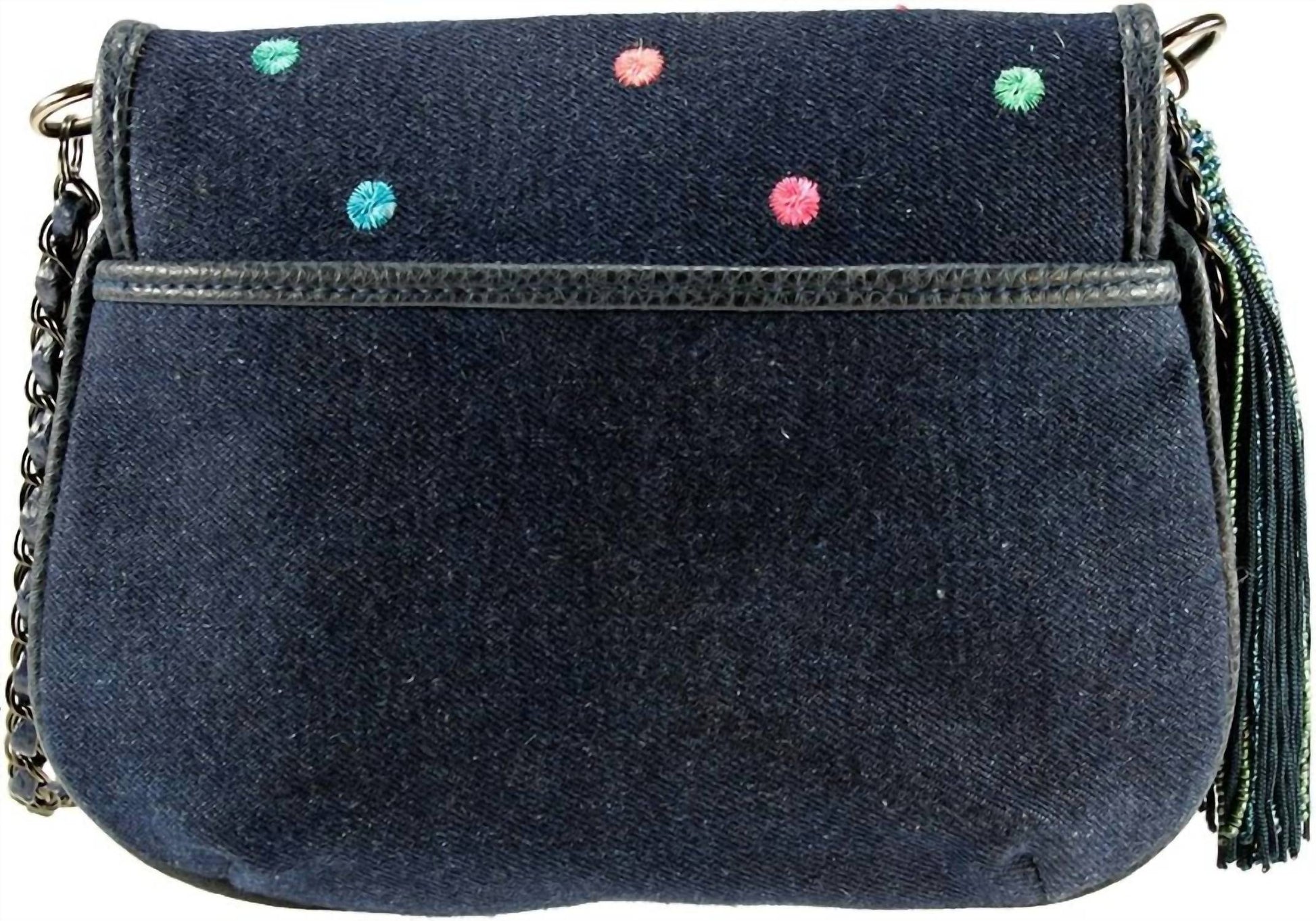 Now trending: Mini bags! Navy Denim with Bright Colored Flowers. Non Removeable Leather Chain Shoulder Strap. Magnetic Snap Closure. 7 1/2" L x 2" D x 6" H