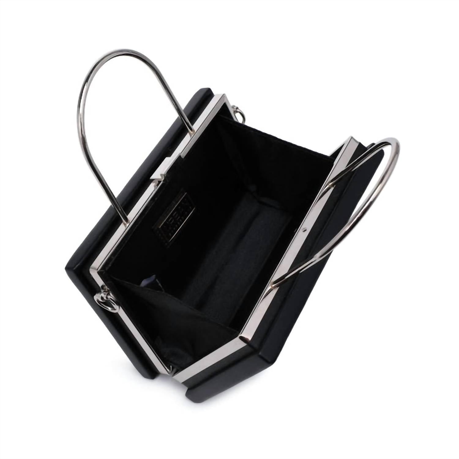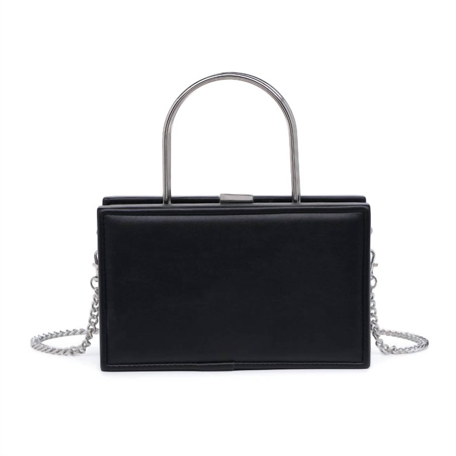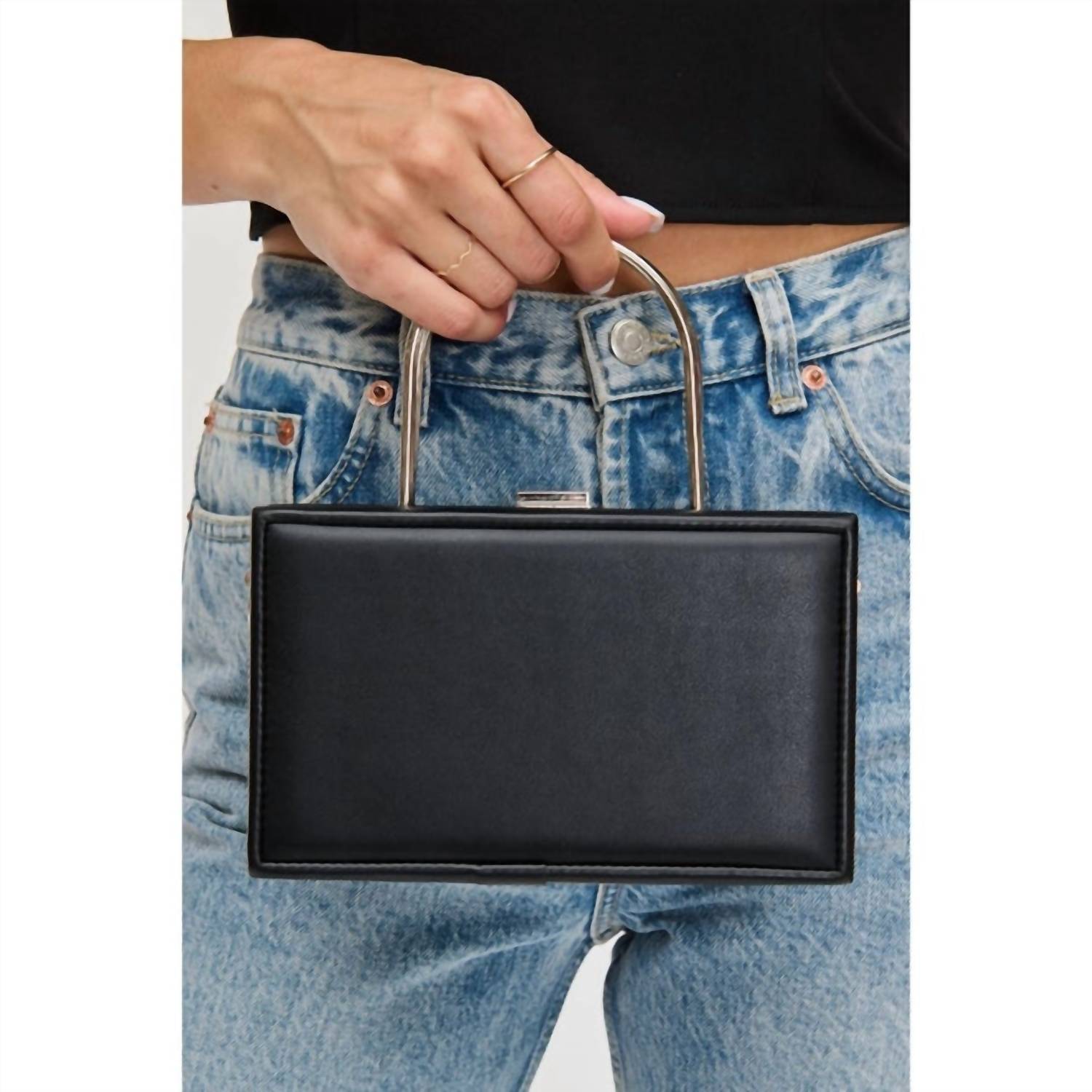 Smooth vegan leather. Compact 8" x 5.1" x 2.2". Chic box shape with snap closure. Metal top handle. Gold hardware. Detachable shoulder strap. Elegant and practical.