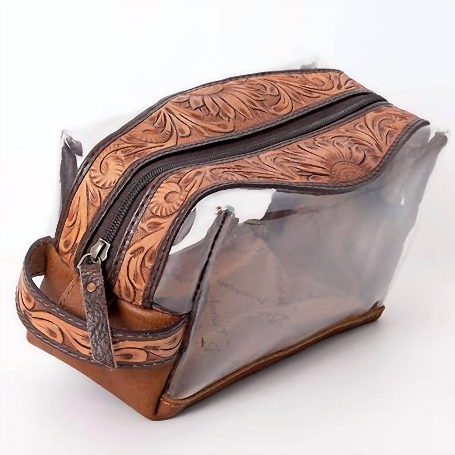 This little number holds all of the important things... lipstick, mints, credit card. Introducing the Women's Clear Bag by American Darling, a stunning blend of Western culture and modern style crafted from hand-tooled, carved, and painted vegetable-tanned American cowhide leather. This luxurious mini bag in brown shows off high-grade thick transparent vinyl and genuine YKK brand zippers for long-lasting durability, ensuring the security of your essentials. Dimensions: 5.5 inches in height, 10 inches in width, and 4 inches in depth. Ideal for making a bold yet stylish statement, this eco-friendly leather bag is meticulously created by skilled craftsmen in Texas.