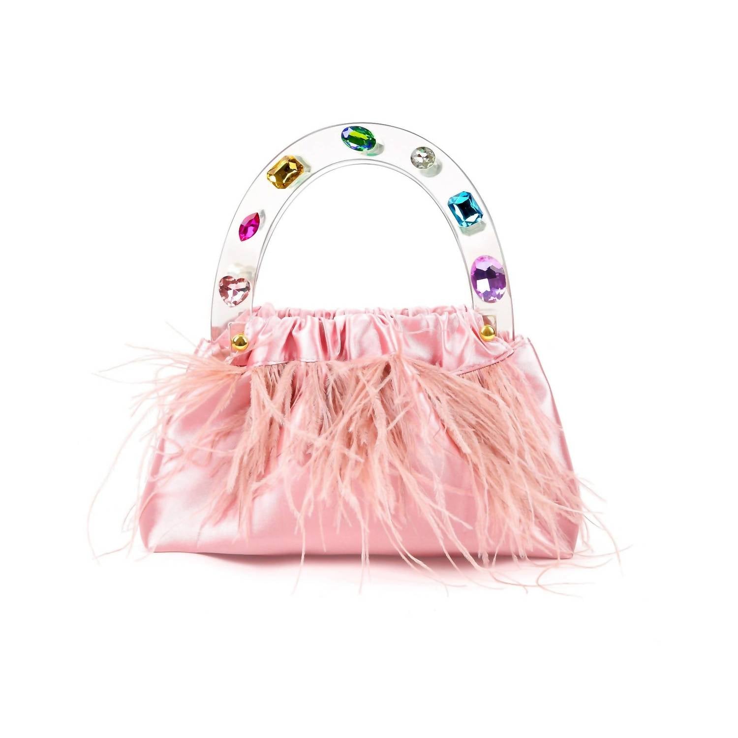 This little number holds all of the important things... lipstick, mints, credit card. Discover the Women's Colorful Gem Handle Embellished Feather Bag by Milanblocks, where eco-friendly elegance meets playful design. Crafted from light pink eco-satin, this mini bag features an eye-catching acrylic gemstone embellished handle. Proudly made with at least 50% eco-materials, it embodies both style and sustainability. The compact dimensions of 4" x 7" x 5" make it a perfect accessory for adding a chic touch to any outfit.