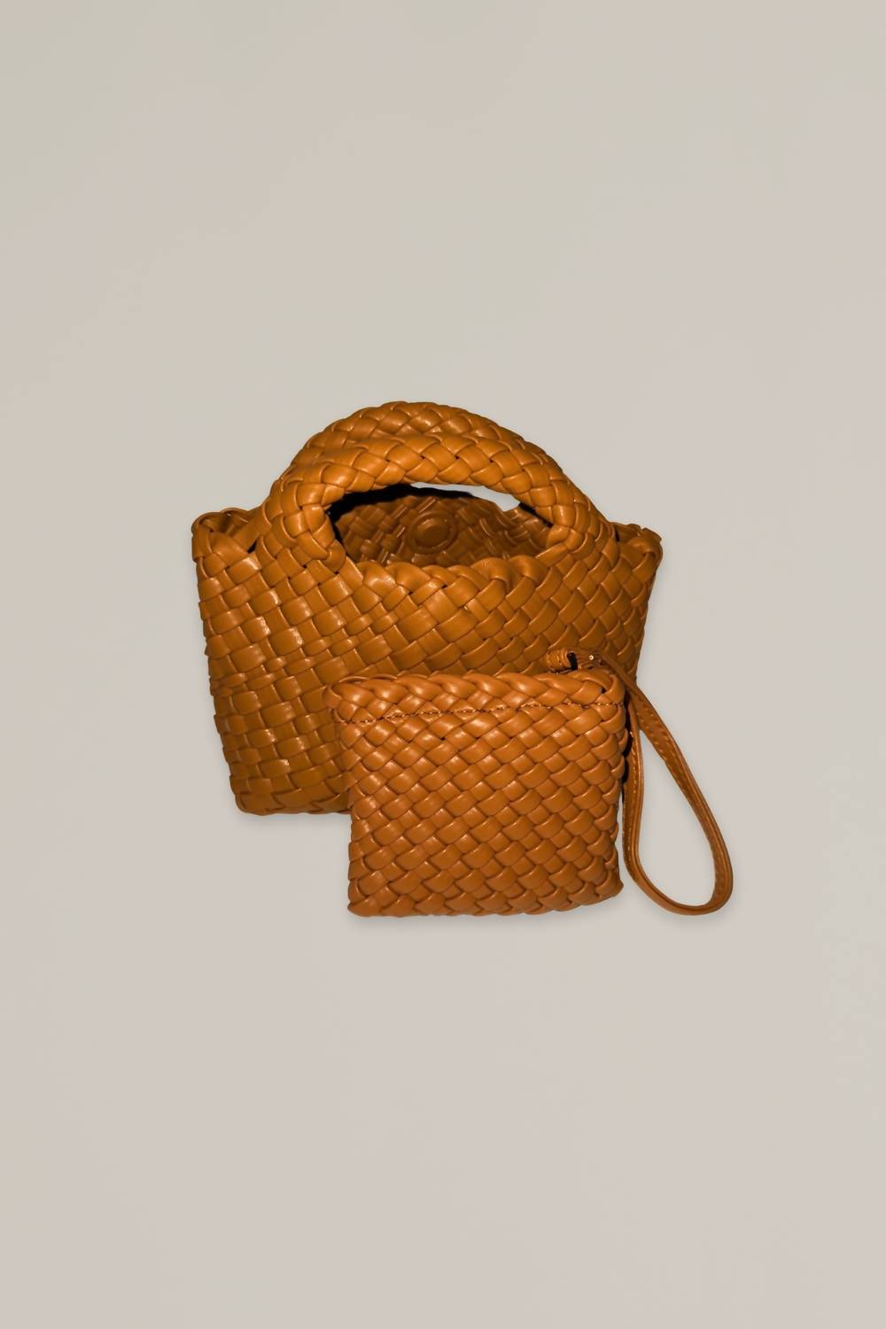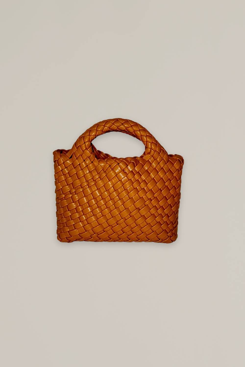 Small in size but a total statement maker. Elevate your accessory game with the Mini Woven Bag by ACCESSORY CONCIERGE, a chic piece crafted from vegan leather in a warm cognac hue. The perfect companion for any occasion, it easily accommodates an iPhone 15 Pro Max, keys, and small cosmetics. This versatile bag includes a detachable crossbody strap and mini zipper pouch that doubles as a wallet. Dimensions: 7.5" x 5".