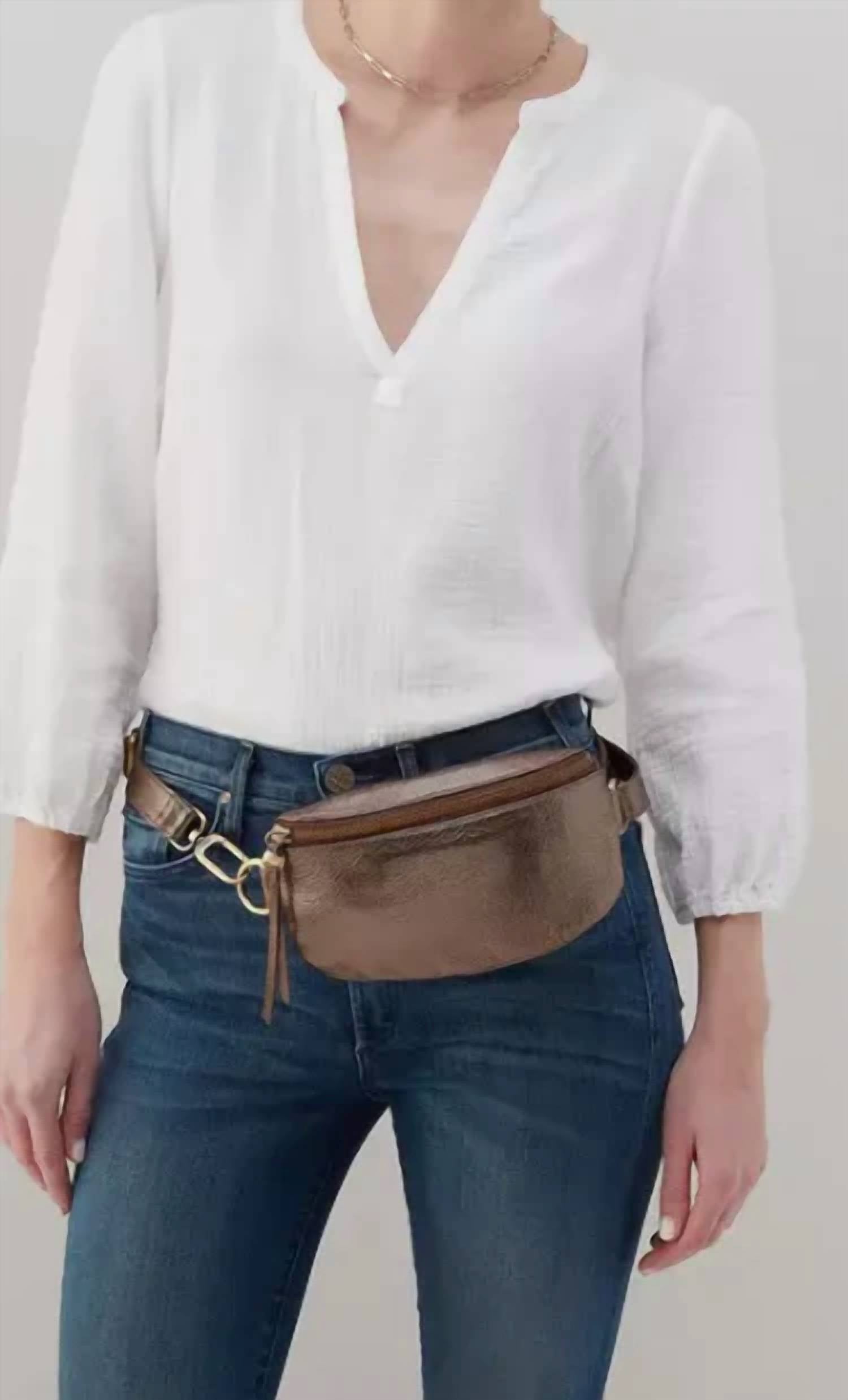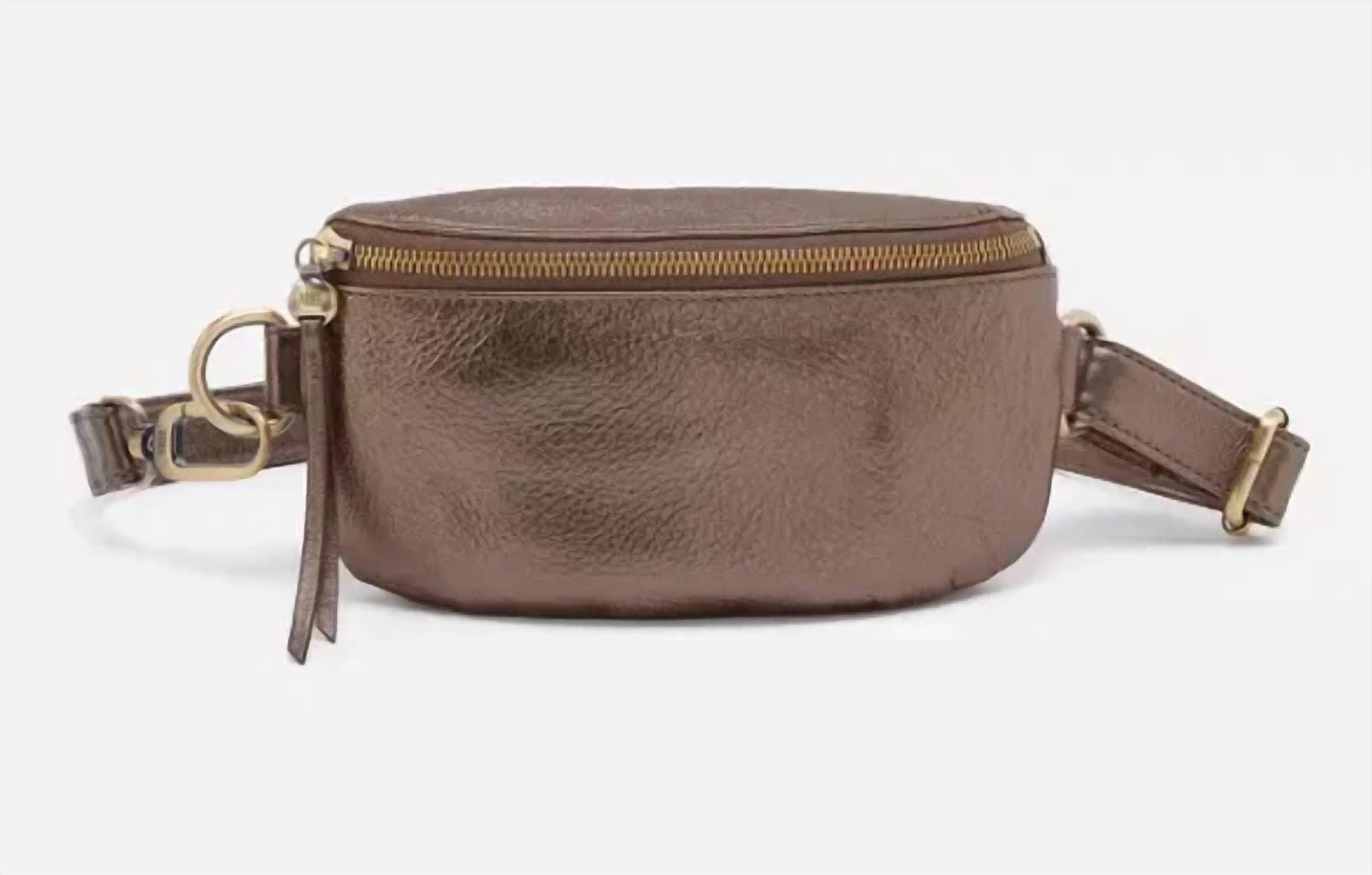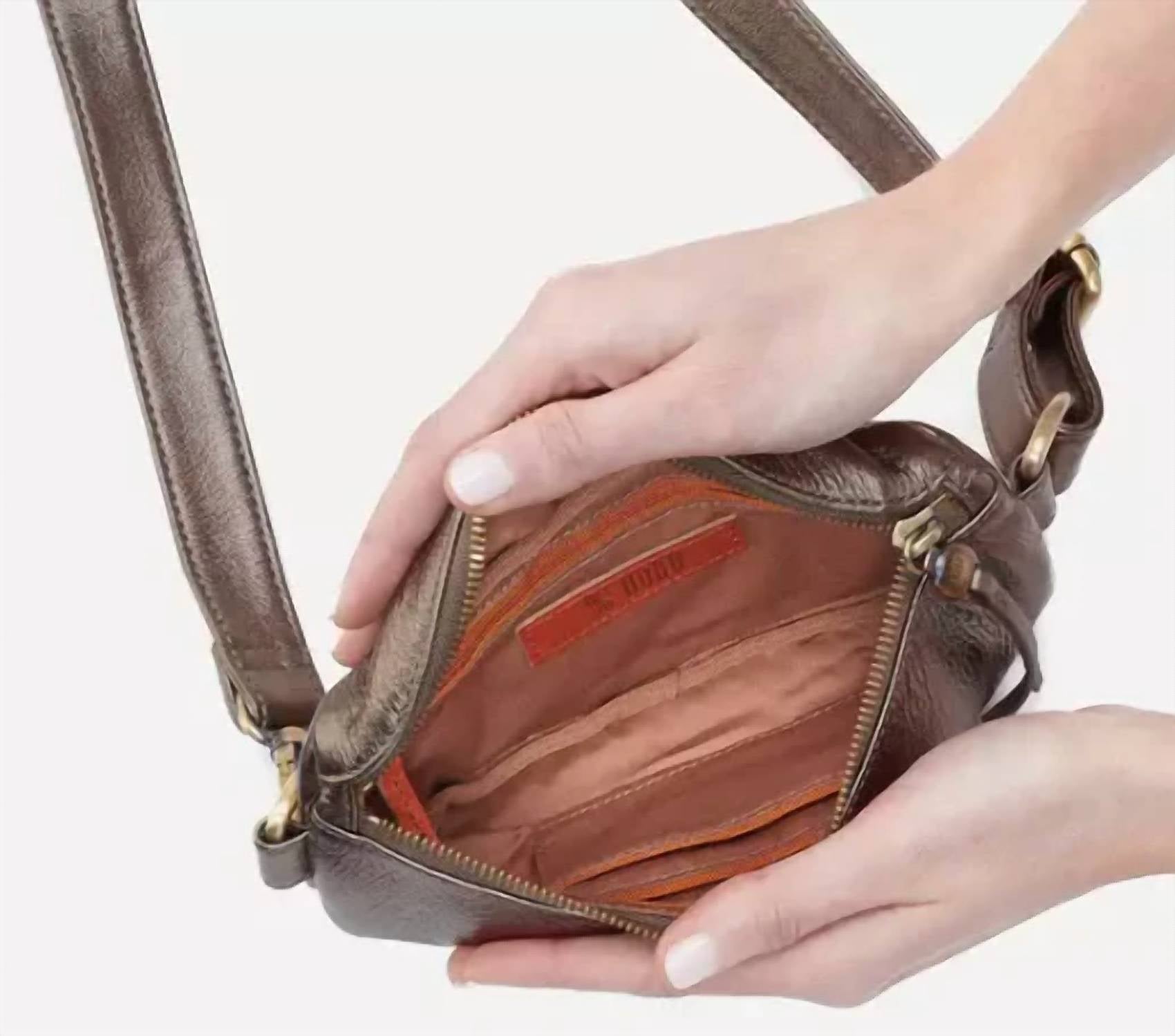 Now trending: Mini bags! 8.5" W X 5.5" H X 1.5" D Sandlewood Lining Interior Front: 3 credit card slots; Interior Back: Zip pocket Fits your phone Brushed Antique Brass Hardware Zip Closure 30" - 49” Strap Drop Solid leather single strap Wear as a belt bag or crossbody