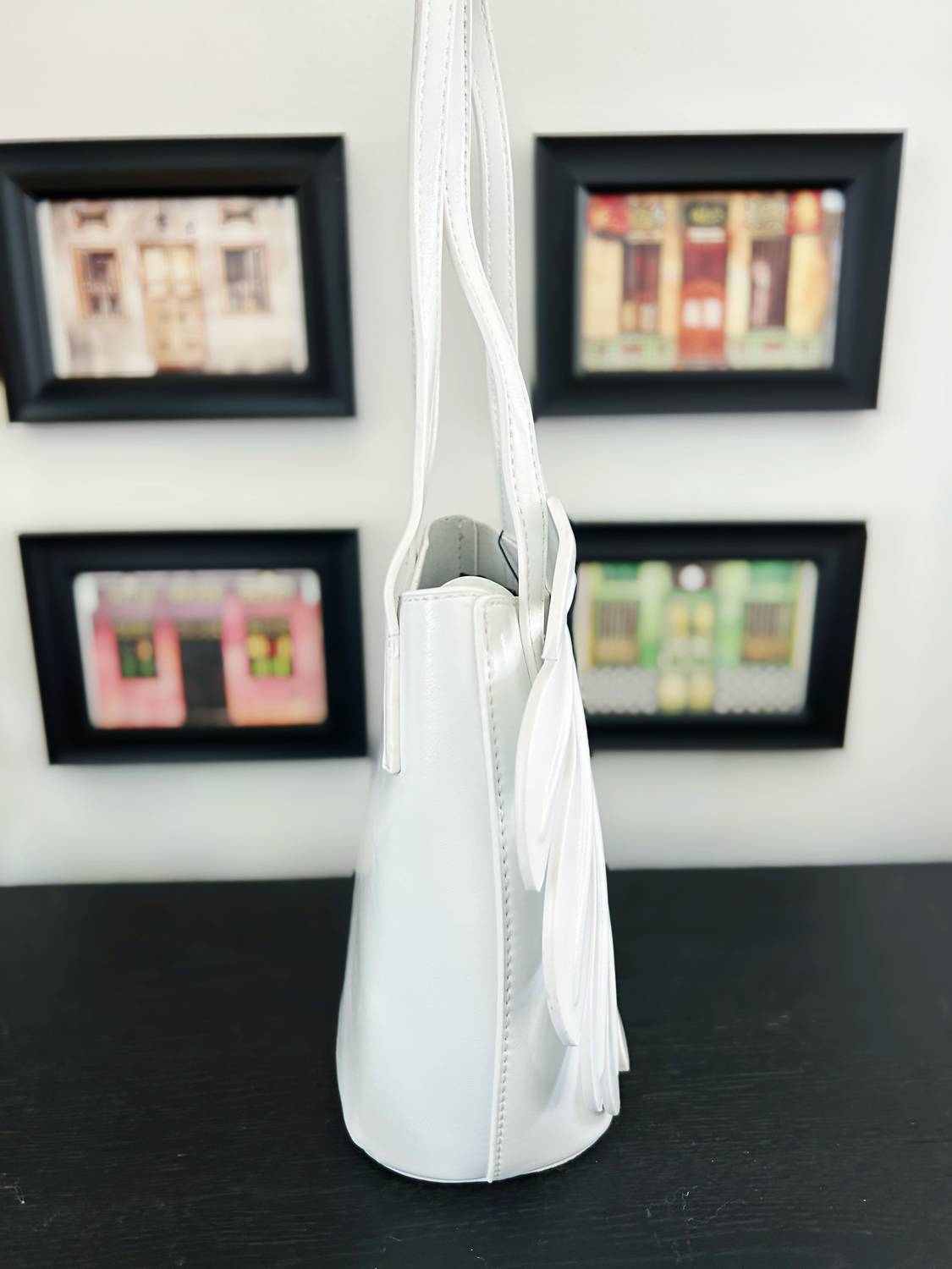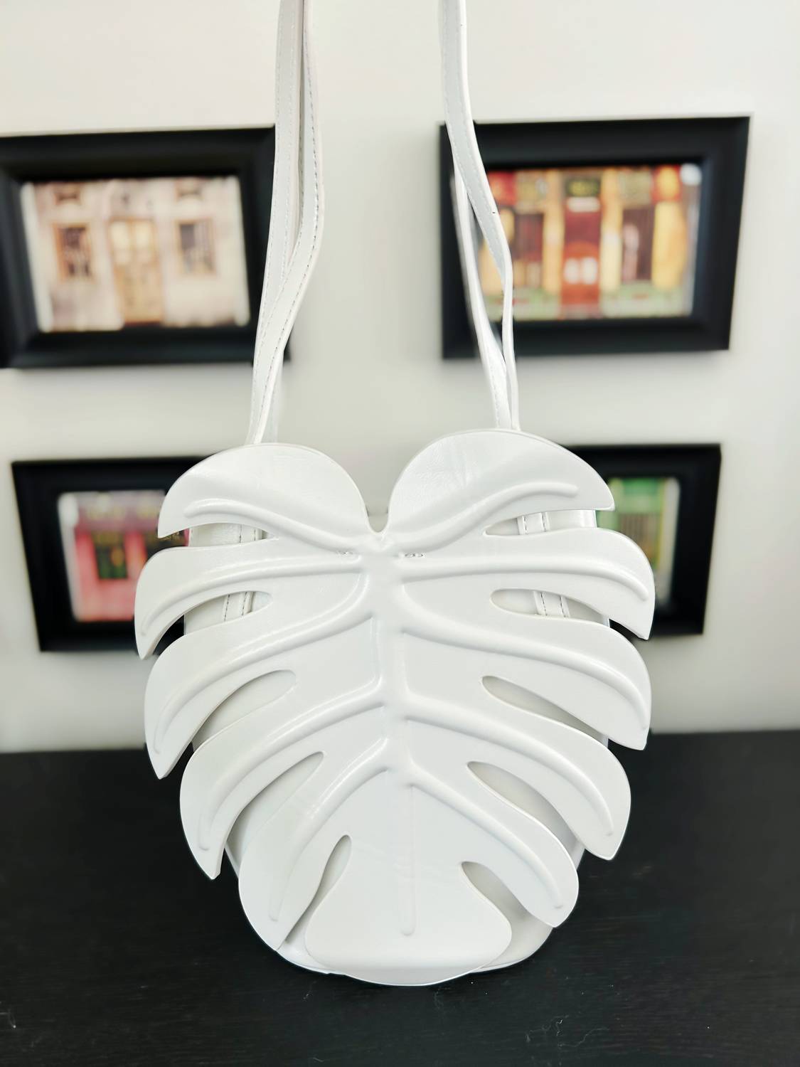 Now trending: Mini bags! Elevate your style with the Women's Palma Leaf Bag by BC Handbags, a chic mini bag inspired by the iconic Monstera plant. This unique handbag in white features bold hues with detailed cutouts and textured veining that capture the essence of tropical foliage. Made from a durable, structured material, it maintains its shape while keeping essentials secure. Designed with dual top handles, its roomy interior makes it both a functional and fashion-forward choice for any outing.