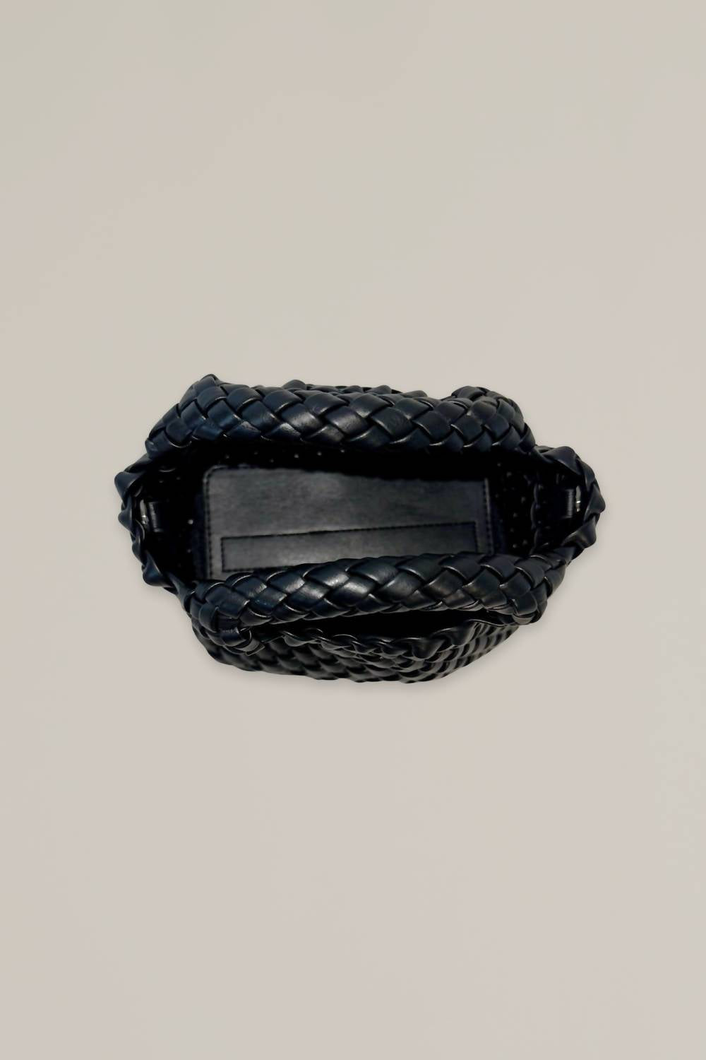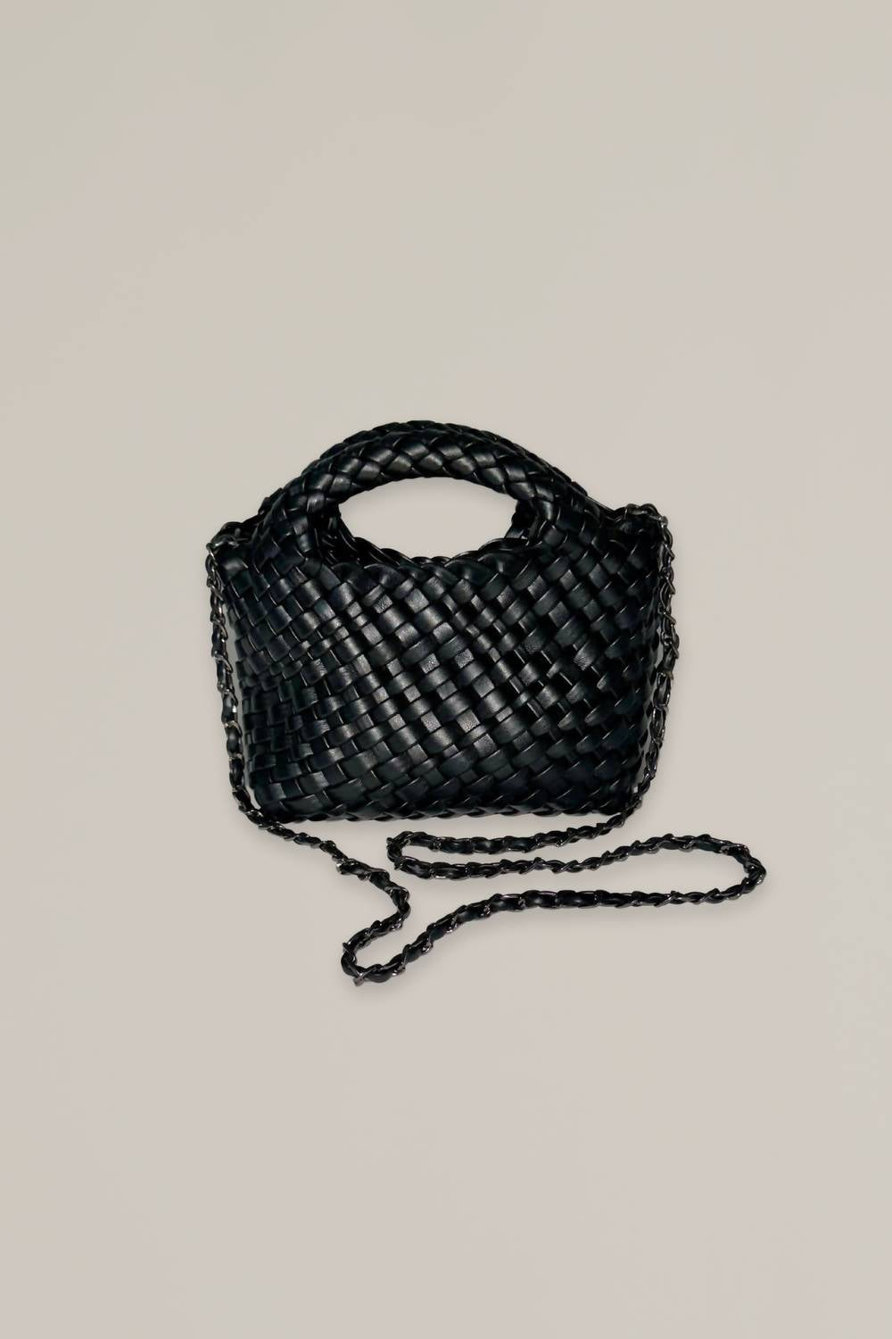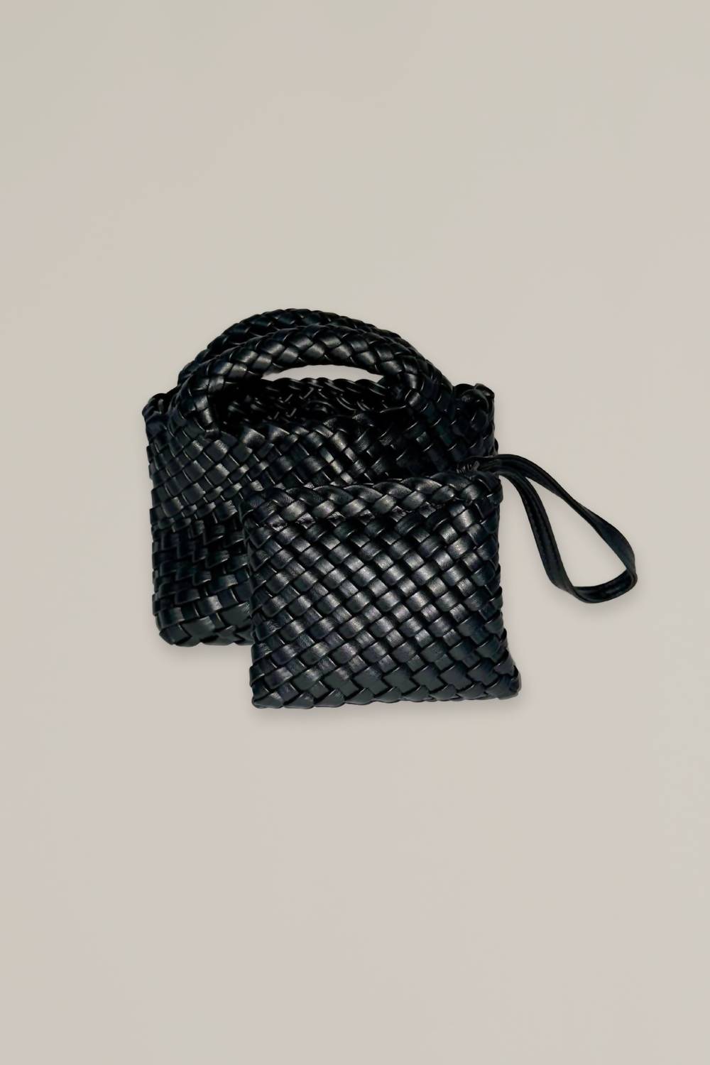 Small in size but a total statement maker. Elevate your accessory game with the Mini Woven Bag by ACCESSORY CONCIERGE, a chic piece crafted from vegan leather in a warm cognac hue. The perfect companion for any occasion, it easily accommodates an iPhone 15 Pro Max, keys, and small cosmetics. This versatile bag includes a detachable crossbody strap and mini zipper pouch that doubles as a wallet. Dimensions: 7.5" x 5".