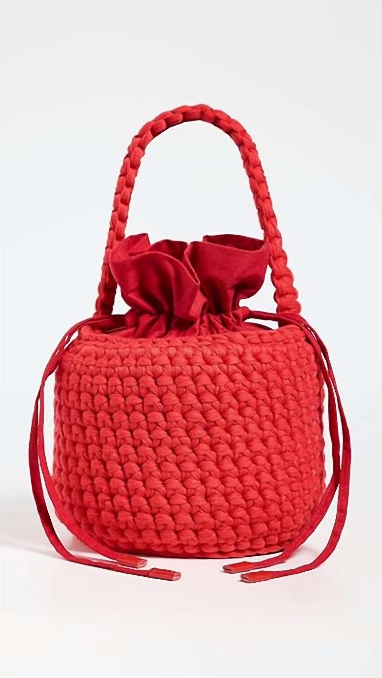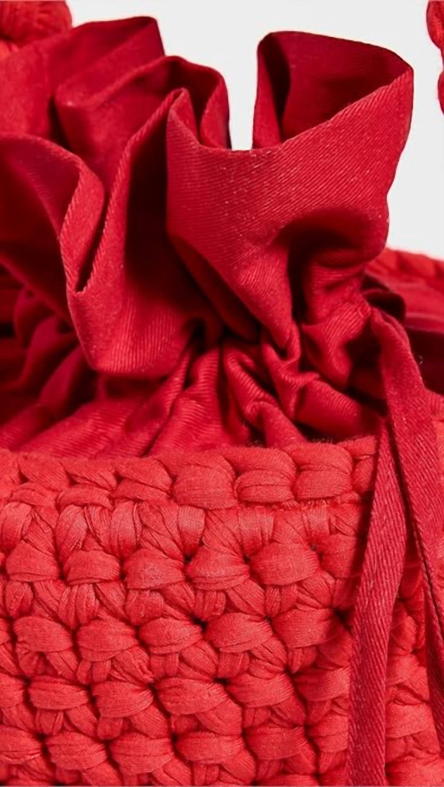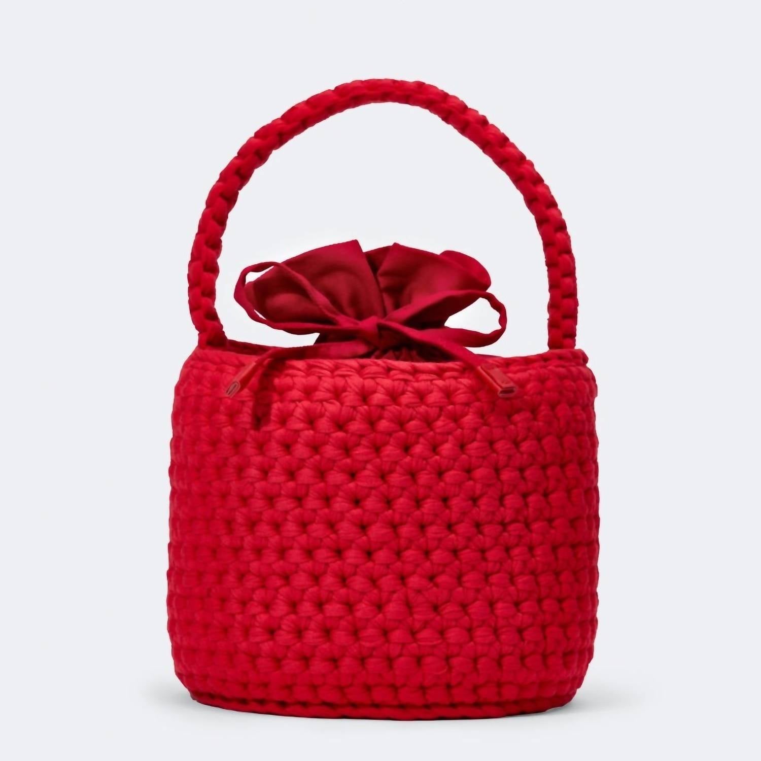 Now trending: Mini bags! The SIMON MILLER Women's Crochet Grab Bag in Paprika is a distinctive accessory that blends rustic charm with modern elegance. Crafted with a crochet knit exterior and twill lining, it secures your essentials with a top drawstring closure. The bag features an integrated top handle with a 6.75-inch drop and provides ample space with its single main compartment. Measuring approximately 6.5 inches in width, 6.25 inches in height, and 6.5 inches in depth, it's the perfect compact carryall for minimalist fashionistas.