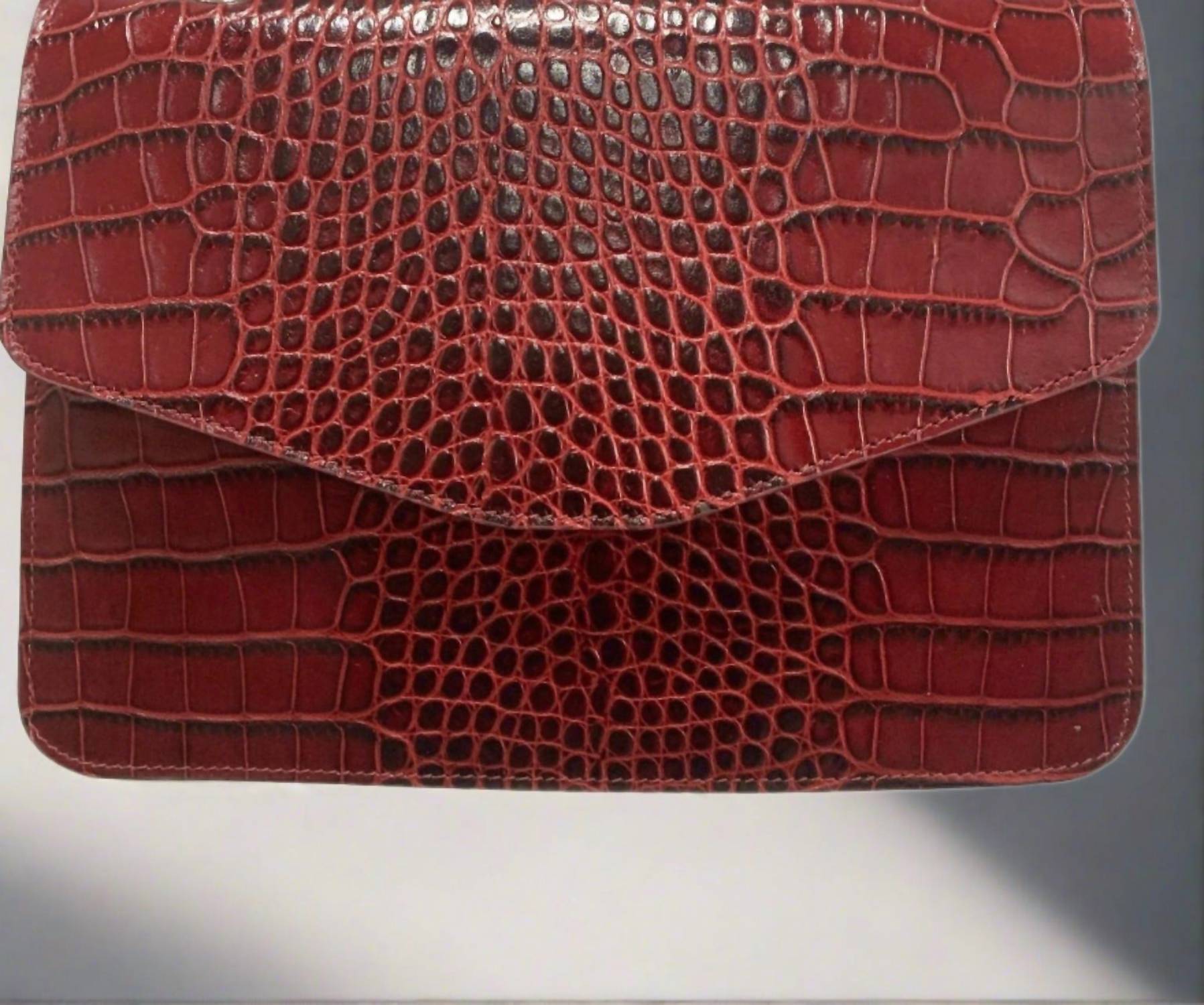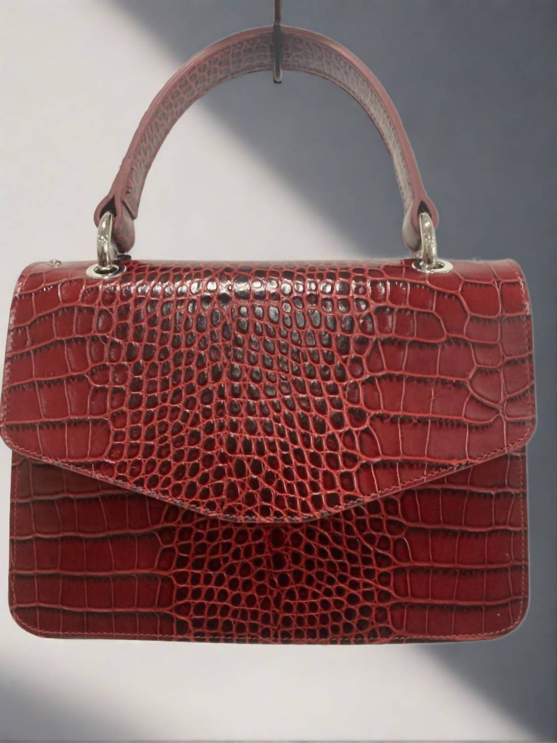 This little number holds all of the important things... lipstick, mints, credit card. Introducing the Women's Terra Handbag by Bergè, a chic and timeless mini bag in elegant Bordeaux. Crafted from croc-printed Italian leather with a fold-over flap pocket and complemented by silver hardware, this handbag epitomizes sophistication. It features a snap closure, an interior zip pocket, two slip pockets, and comes with an adjustable shoulder strap for versatility. Dimensions: 9.5" L x 7" H x 4" D.