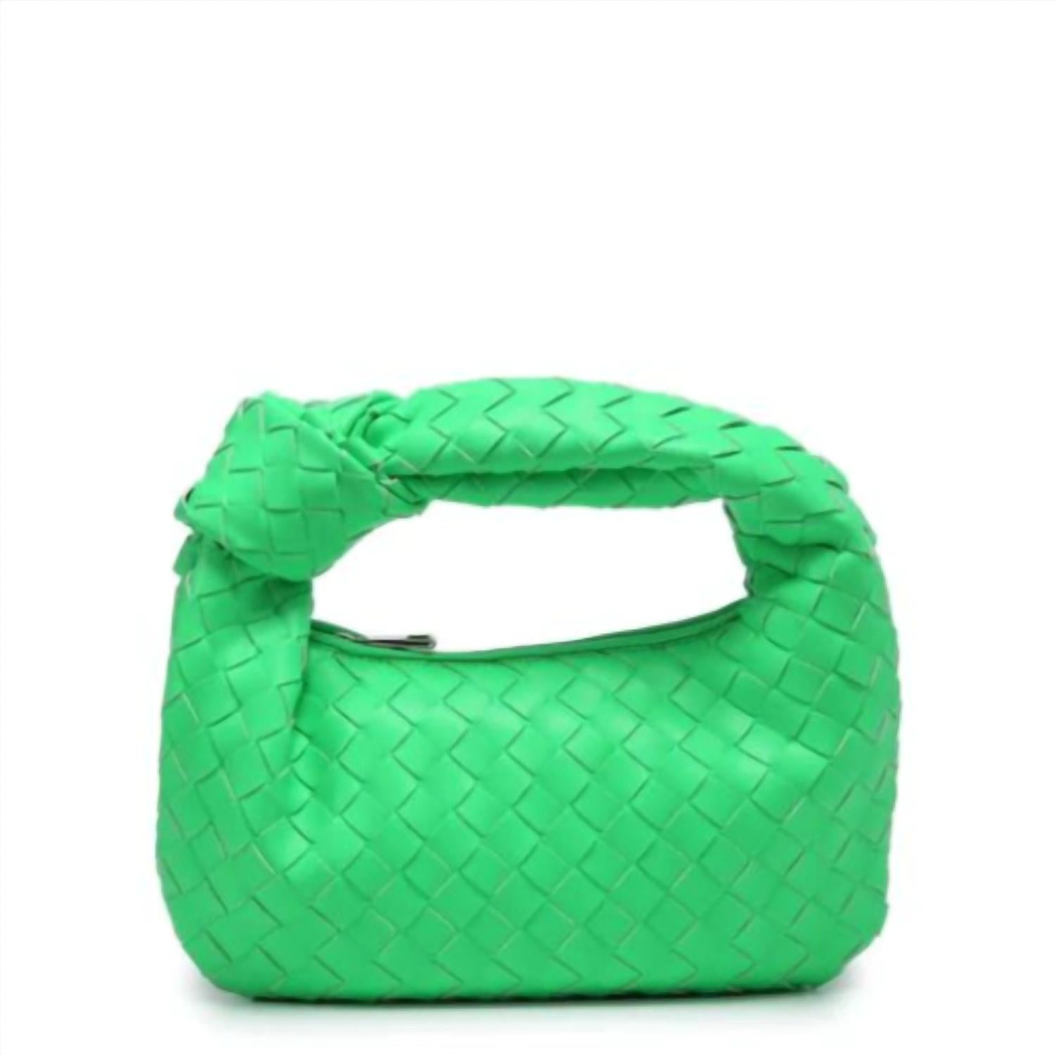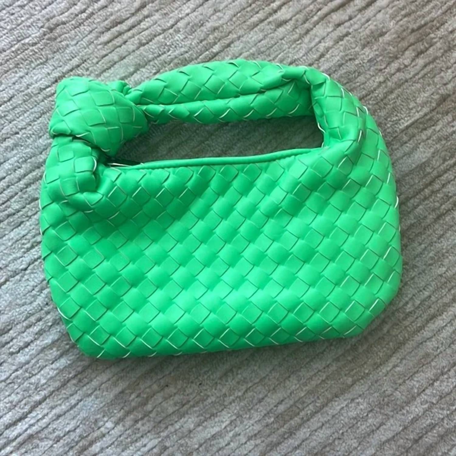 This little number holds all of the important things... lipstick, mints, credit card. Introducing the Braided Hattie Bag by Accessory Concierge, an essential accessory in a striking green hue. Crafted from soft vegan braided leather, this mini bag offers style versatility for any occasion. It features a secure zip closure and measures approximately 9 inches wide, making it perfect for on-the-go essentials. Embrace the perfect blend of fashion and function with this standout piece.