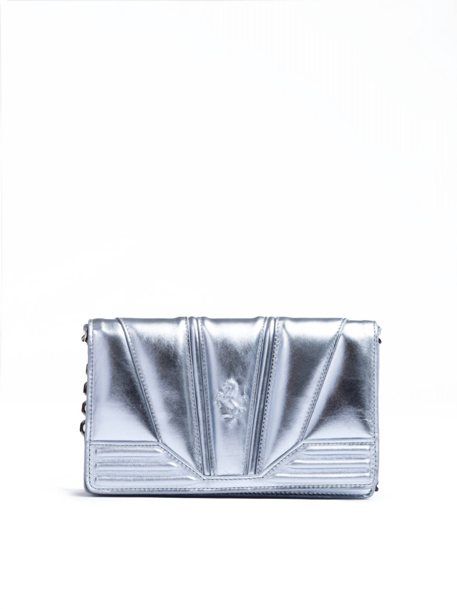 Small in size but a total statement maker. Elevate your accessory game with the Women's GT Patent Leather Bag by Ferrari, a statement piece in striking Metal Light blue. Crafted from 100% Calf leather with ruthenium-finished metalwork, this bag is made in Italy, exuding sophistication and style. It features an adjustable shoulder strap and has ample space with one zippered pocket and two card compartments, all enhanced by tonal edges, stitching, and the iconic Prancing Horse detail. Dimensions: 16 cm (H) x 21 cm (W) x 8 cm (D).