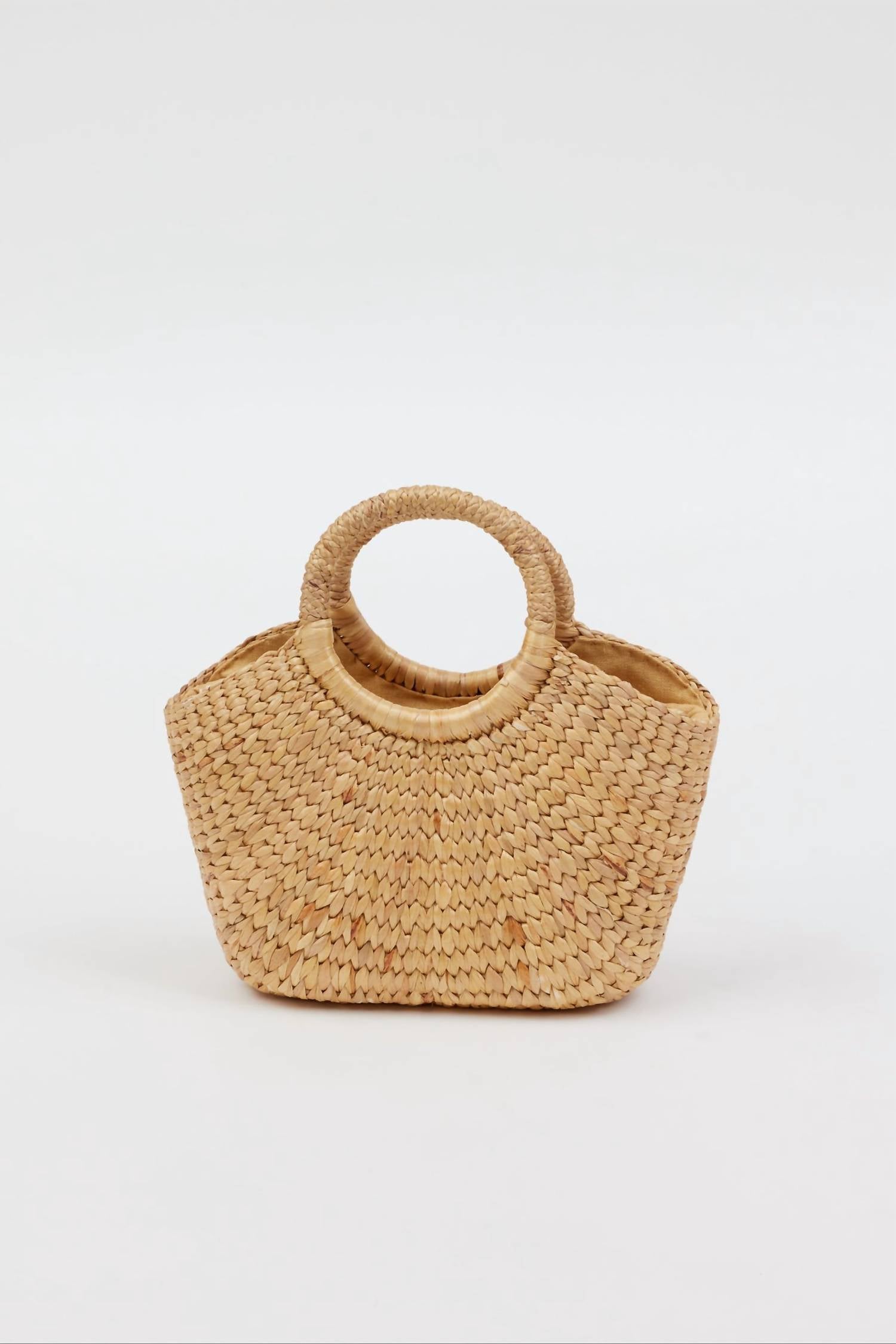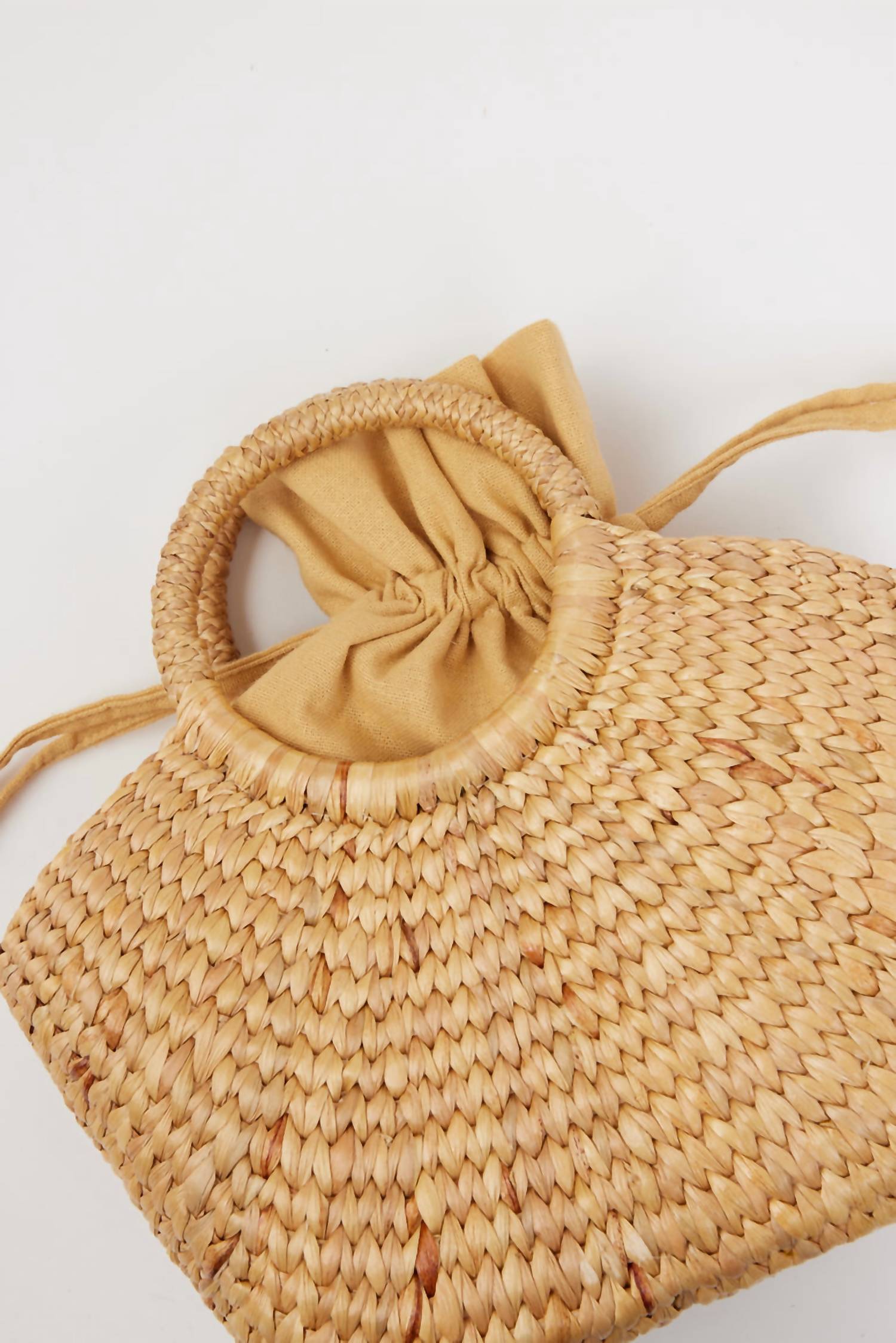 Now trending: Mini bags! Carry your summer essentials with flair in the Women's Marley Mini Bag by Hat Attack, a stylish and practical accessory in a natural hue. This structured woven bag is crafted from 100% water hyacinth and features a 100% cotton lining for a touch of elegance. Designed with a convenient drawstring closure and a round handle, it measures 10" x 6.5” x 2.5”. Care: Spot clean with a damp cloth for easy maintenance.