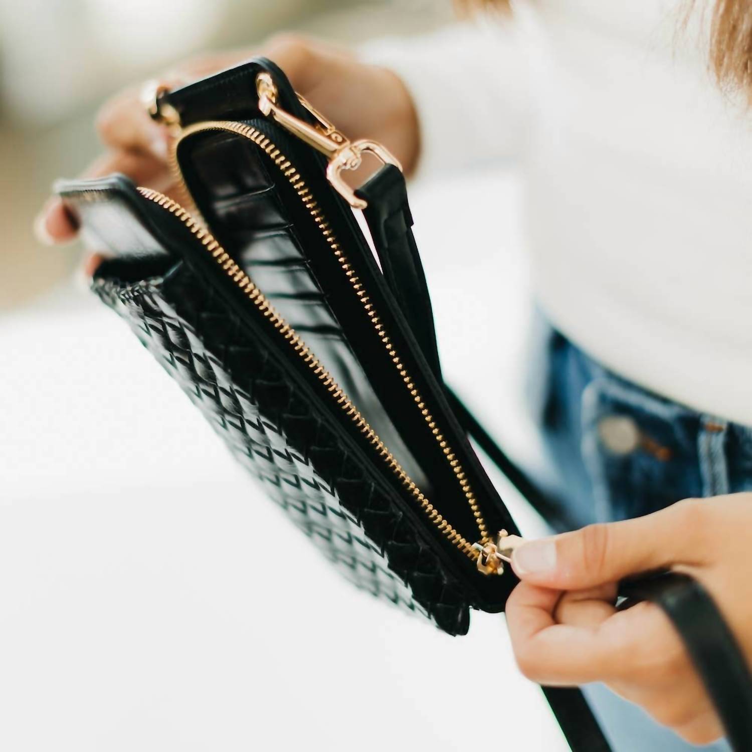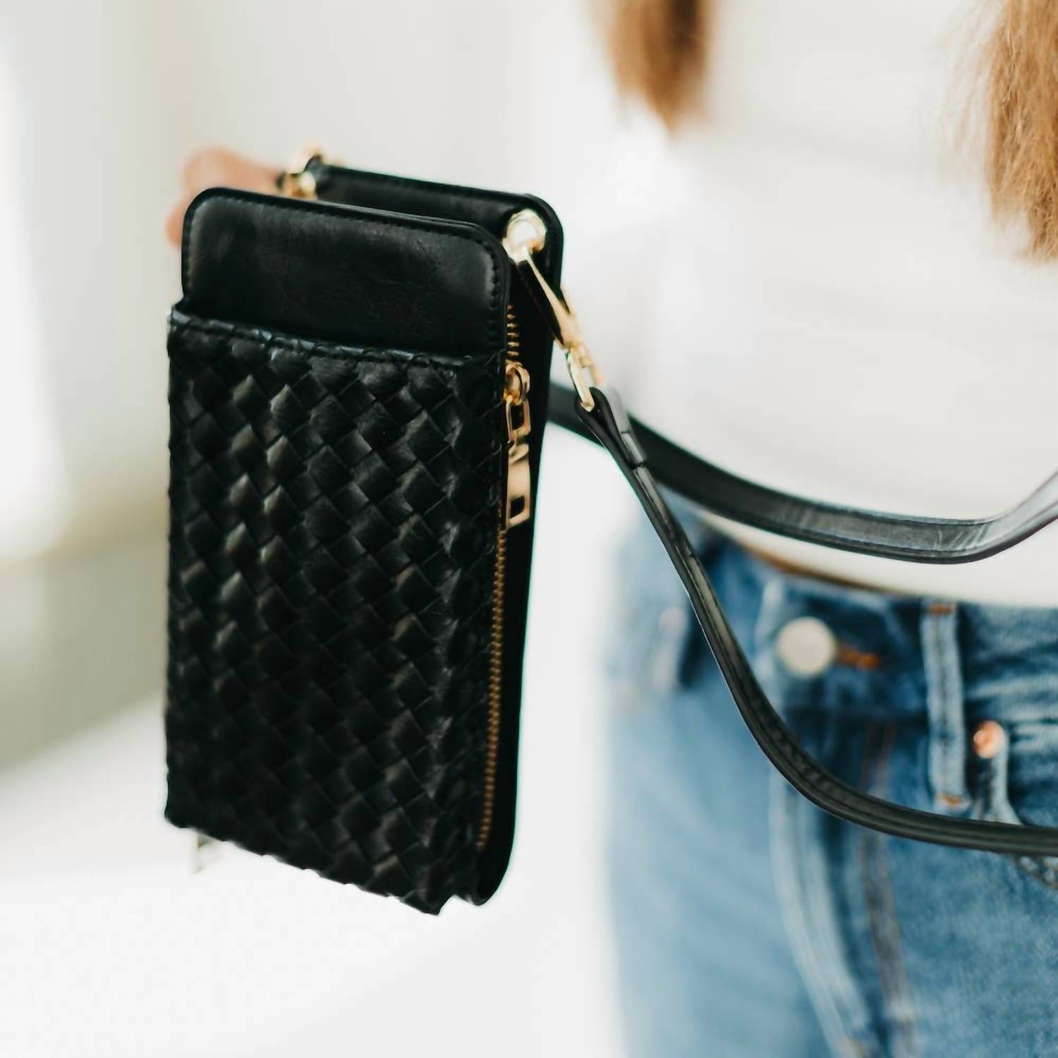 Now trending: Mini bags! Introducing the Women's Double Duty Phone Bag by Pretty Simple, a must-have accessory in stylish Woven Black. Crafted from woven PU leather, this bag features a convenient outer phone pouch and an interior with card holders, a cash pocket, and a coin purse. The crossbody strap is both removable and adjustable, offering versatility to suit your style. Dimensions: 7.5"L x 4"W x 1.5"H, with a polycotton liner and elegant gold hardware to complement any outfit.