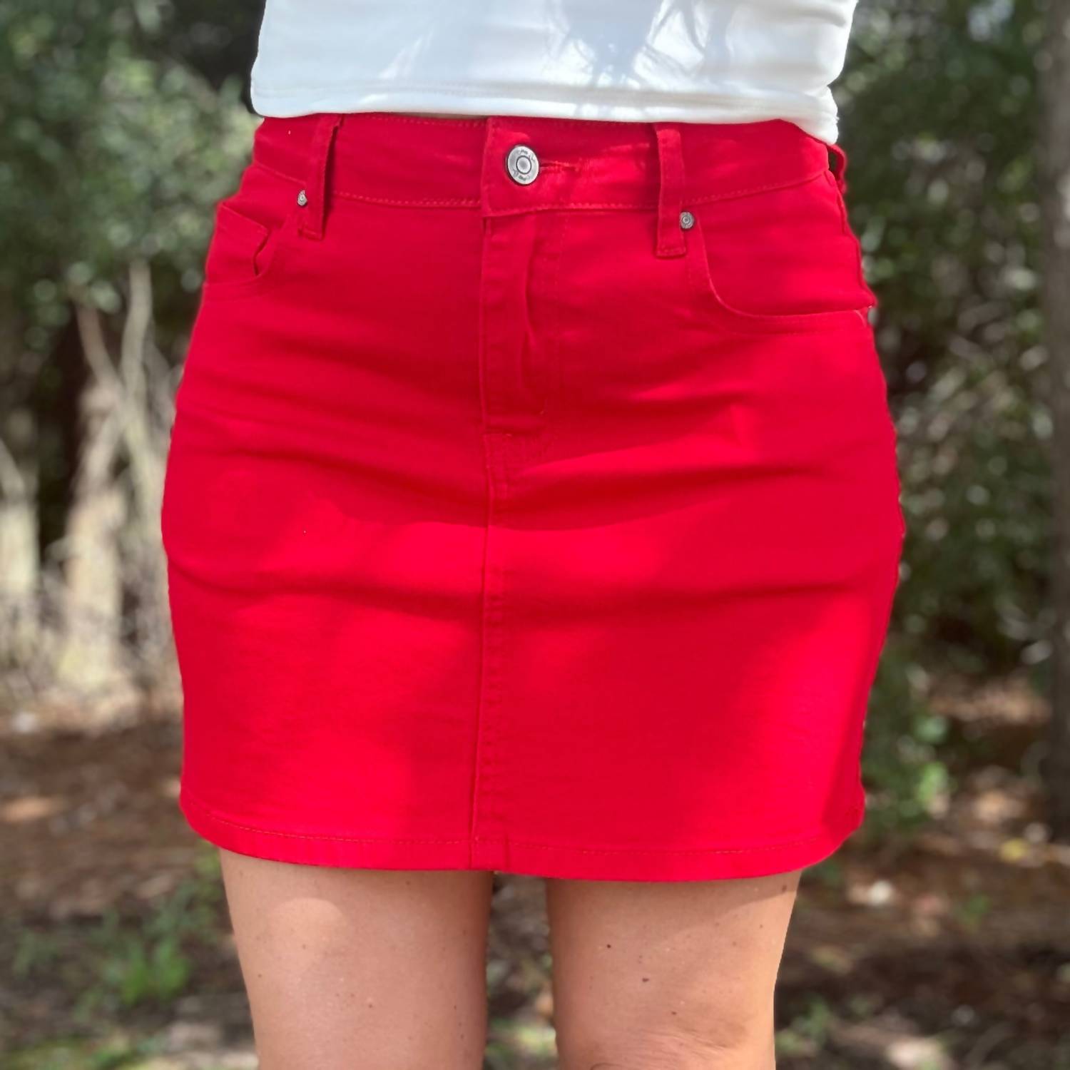 Tuck in your favorite tee for a more laid-back vibe. Introducing the Randy Denim Skirt by Jess Lea, a vibrant red mini designed for modern elegance. This skirt offers a perfect blend of 97% cotton and 3% spandex, providing a comfortable touch of stretch. With a button closure and a length of 15.5" on size small, it's an everyday essential that combines classic look and practicality with pockets. Ideal for fall fashion and maximalist trends, consider sizing up if you're in-between sizes for optimal fit.