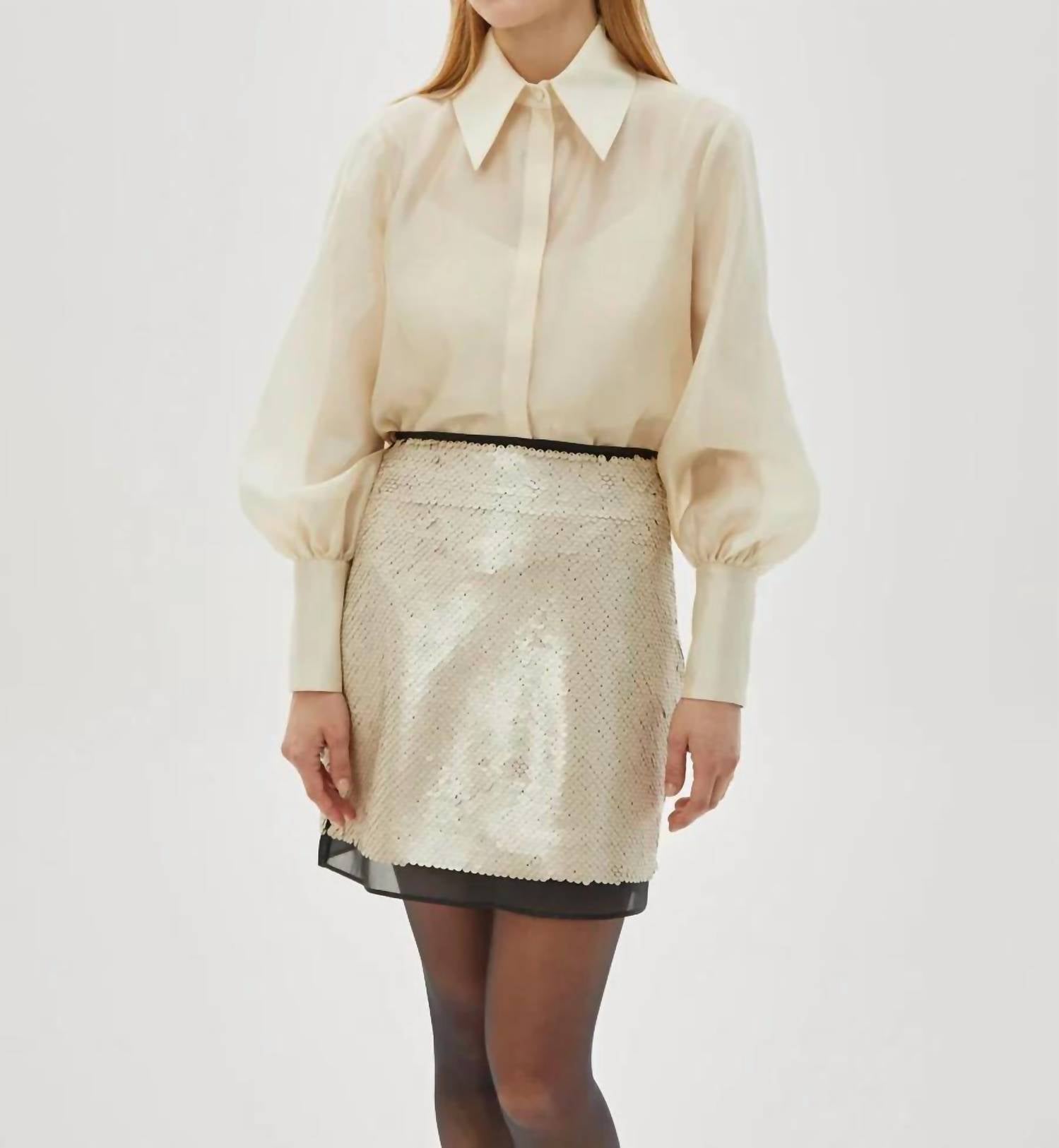 Show just the right amount of leg in this fit flattering mini. Slim-fit gold mini skirt is adorned with sequins, offering a sparkling and elegant look. Crafted with 100% polyester for both its main fabric and lining. Ensures comfort and style. Features a convenient zip closure.
