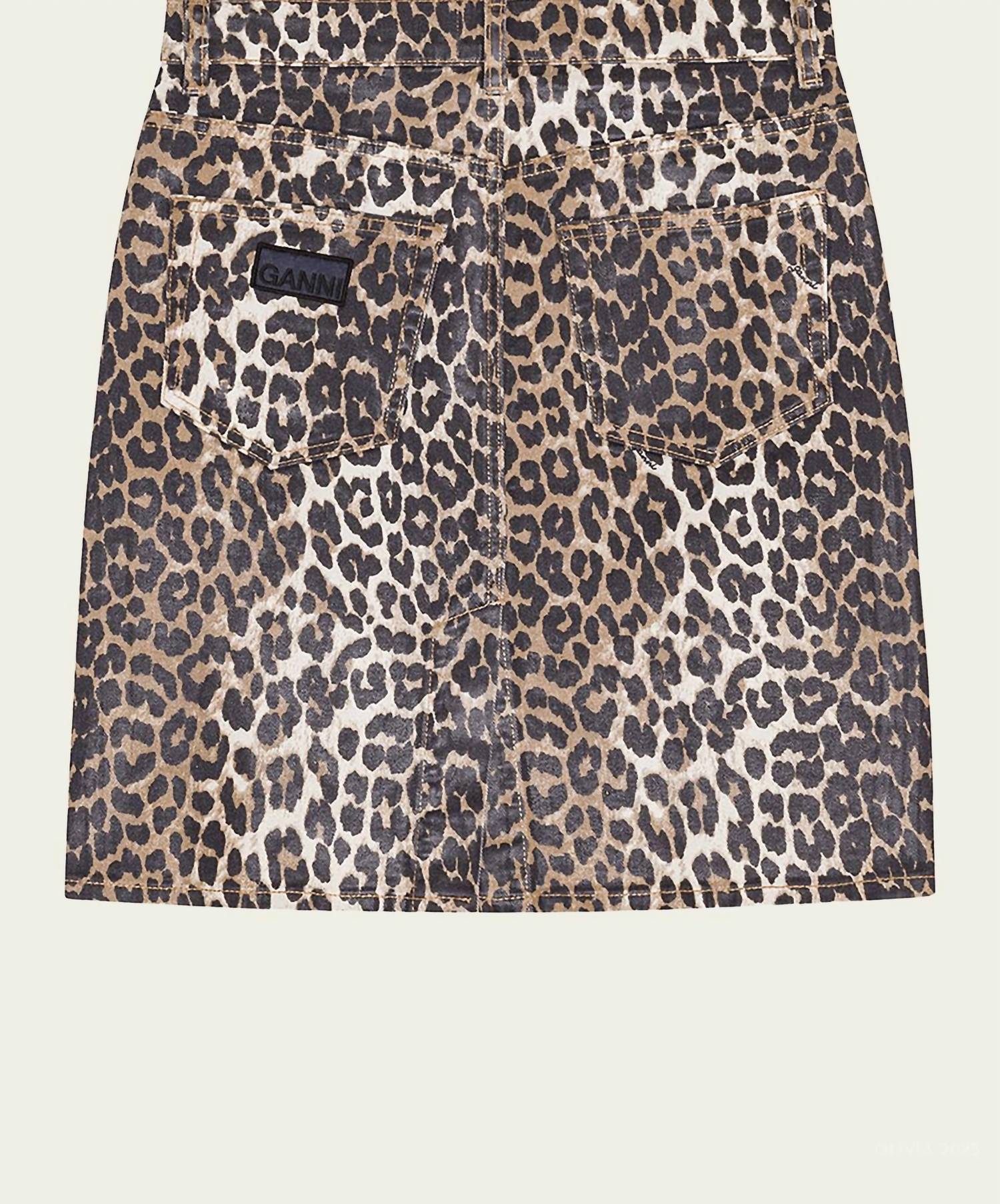 Show just the right amount of leg in this fit flattering mini. The GANNI Foil Print Denim Skirt is a stylish mini skirt in a striking leopard print, perfect for a vacation-ready wardrobe. Crafted from 99% organic cotton and 1% elastane, it offers a comfortable stretch in a shiny foil finish. Designed with a functional button and zipper closure, five pockets, and belt loops, it features the GANNI logo subtly emblazoned on the back pocket. Made in Turkey, this regular-fit skirt requires dry cleaning to maintain its premium quality.