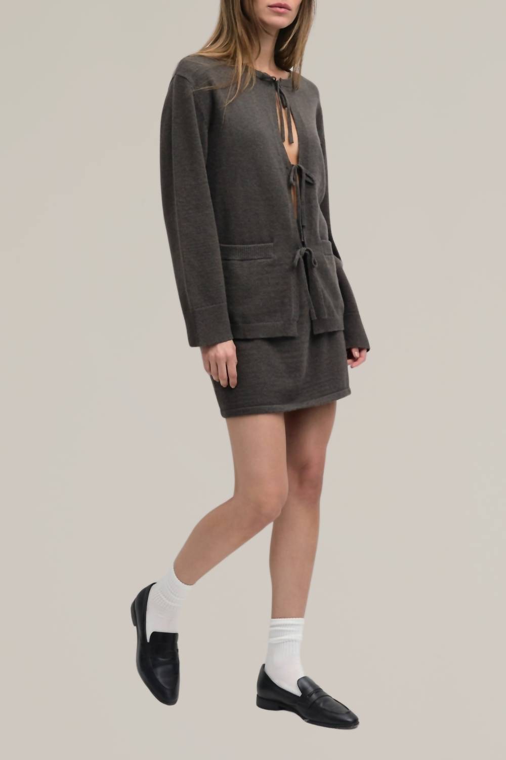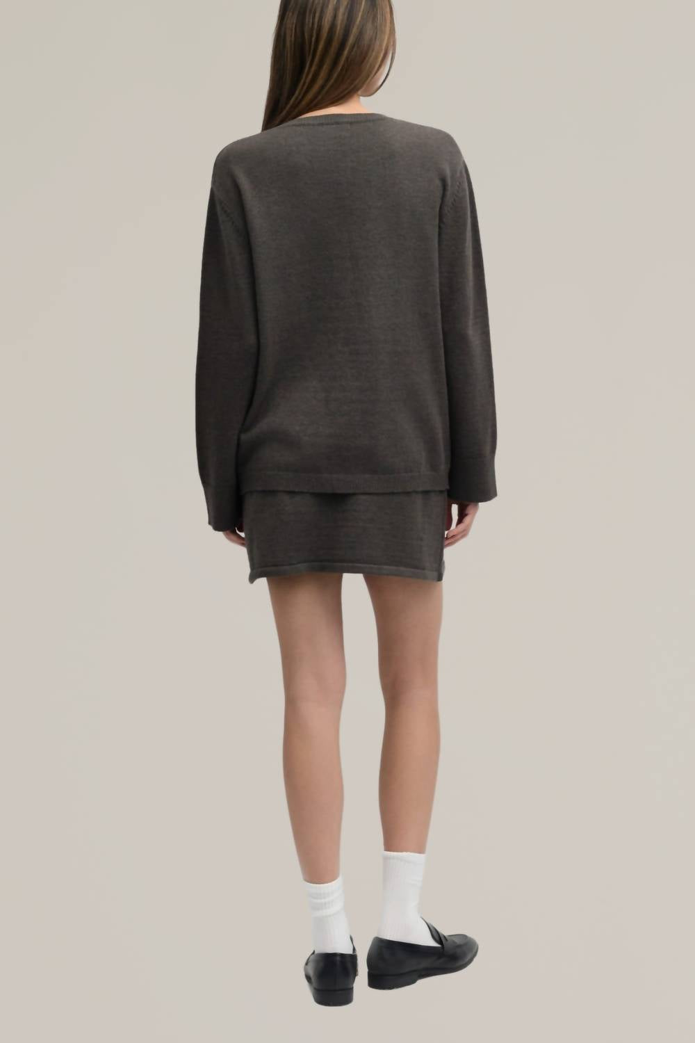 The Knit Sweater Skirt by MOD REF offers chic elegance in a warm chestnut hue. With its composition of 50% acrylic, 28% polyester, and 22% nylon, this mini skirt features a soft, stretchy knit fabric that hugs your curves for a flattering silhouette. Designed for women, it has a convenient pull-on closure. Its care instructions include hand wash cold, avoid bleach, hang dry, and cool iron for optimal maintenance. Model is wearing a size small.