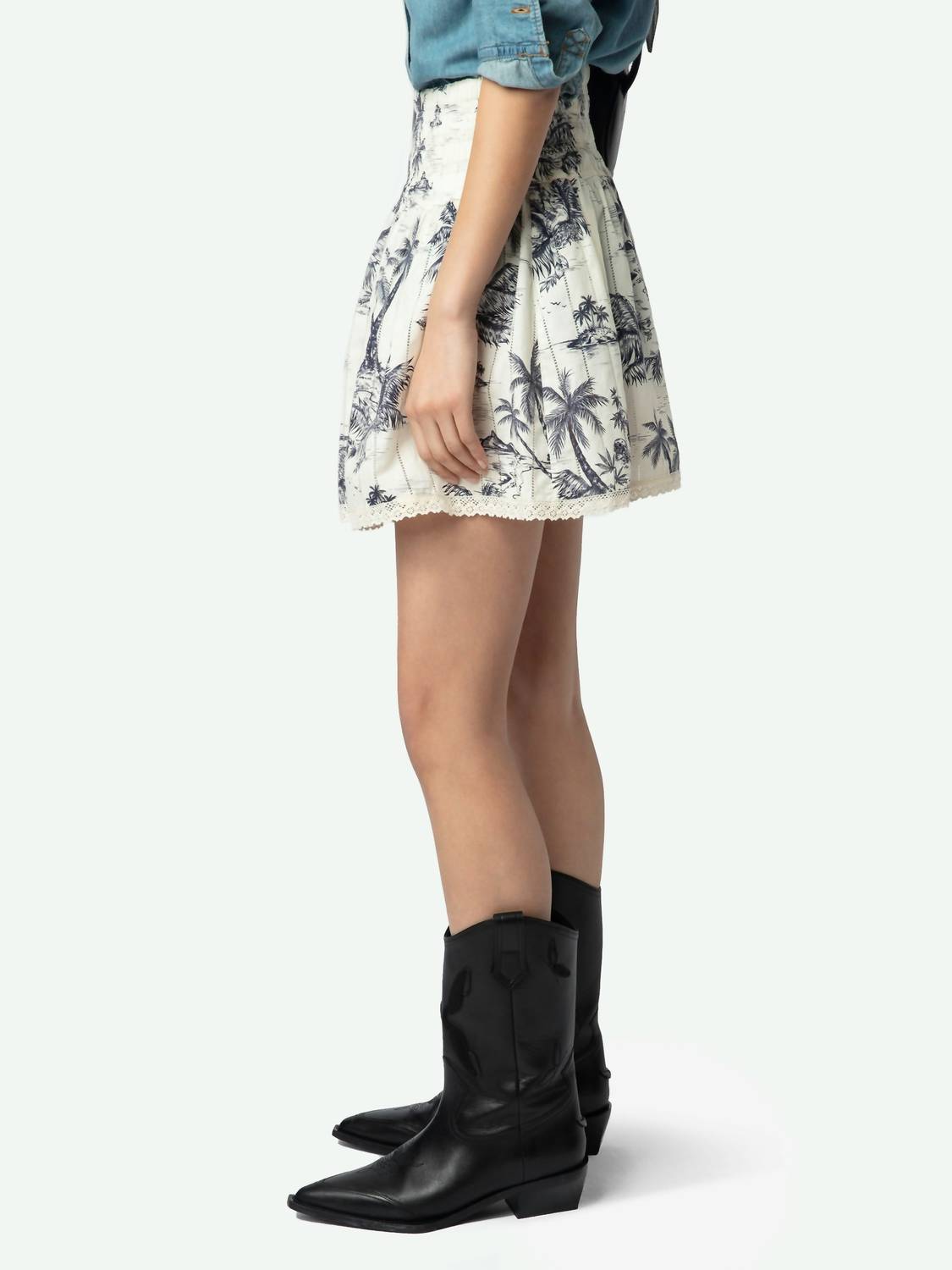 Tuck in your favorite tee for a more laid-back vibe. Introducing the Jocky Skirt in Ecru by Zadig & Voltaire, a perfect addition to your casual wardrobe with a hint of Boho Chic. This delightful mini skirt is crafted from 100% cotton and showcases a trendy Tropical Island print with delicate ladder lace inserts. Designed for an effortless fit, it features an elasticated waist and pleated detailing, finished with a flared hem for added movement. Closure: Pull-on. Care: Machine wash. Ideal for spring vacations, this skirt promises both style and comfort.