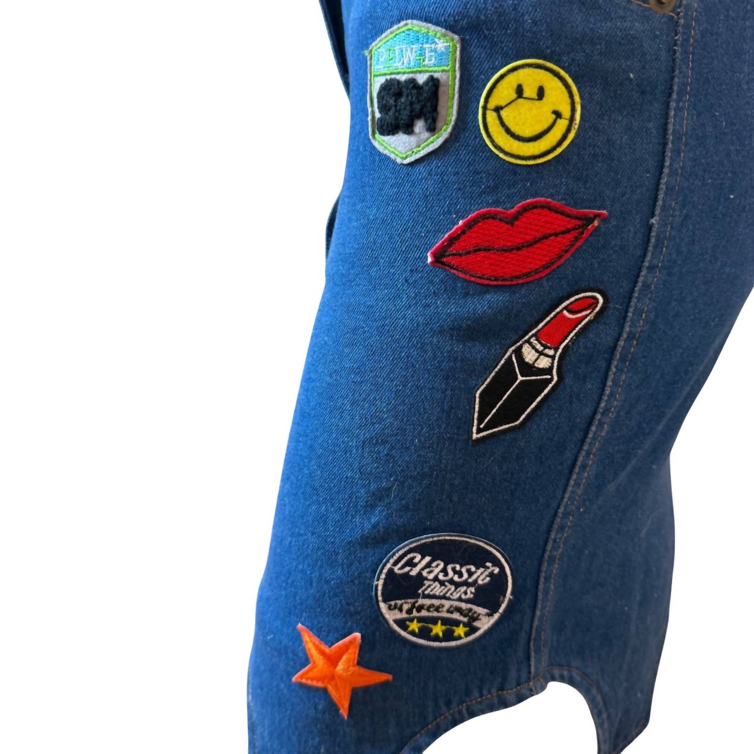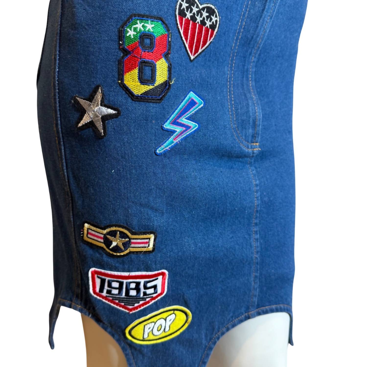 The perfect mini skirt does exist. Fashionable Denim Pencil Mini Skirt with Various Appliques - Lips, Lipstick, Stars, Happt Face, and Others. 2 Front and Rear Pockets, Beltloops, and Front Zip Closure.