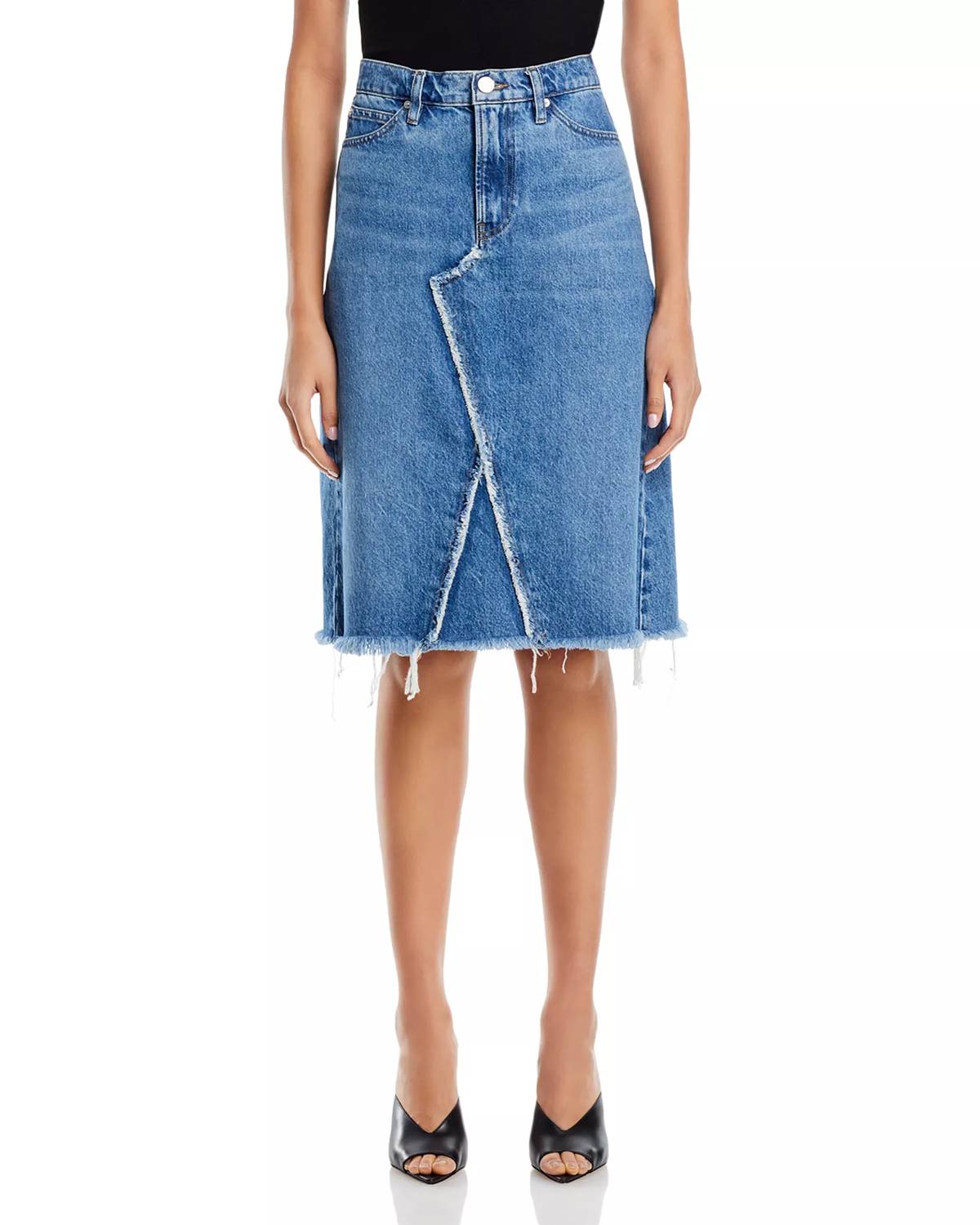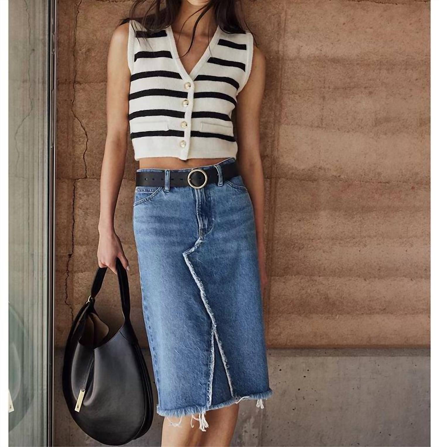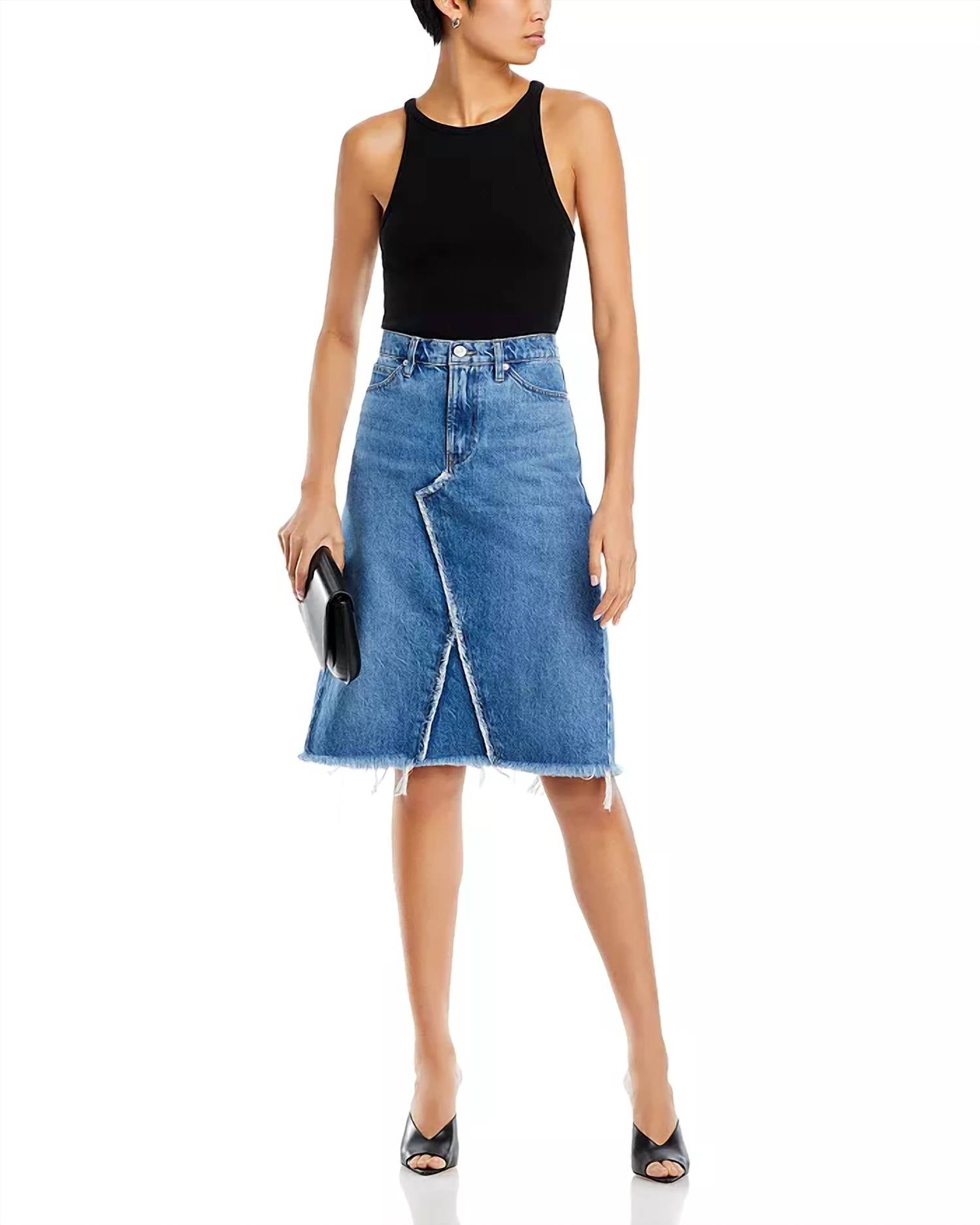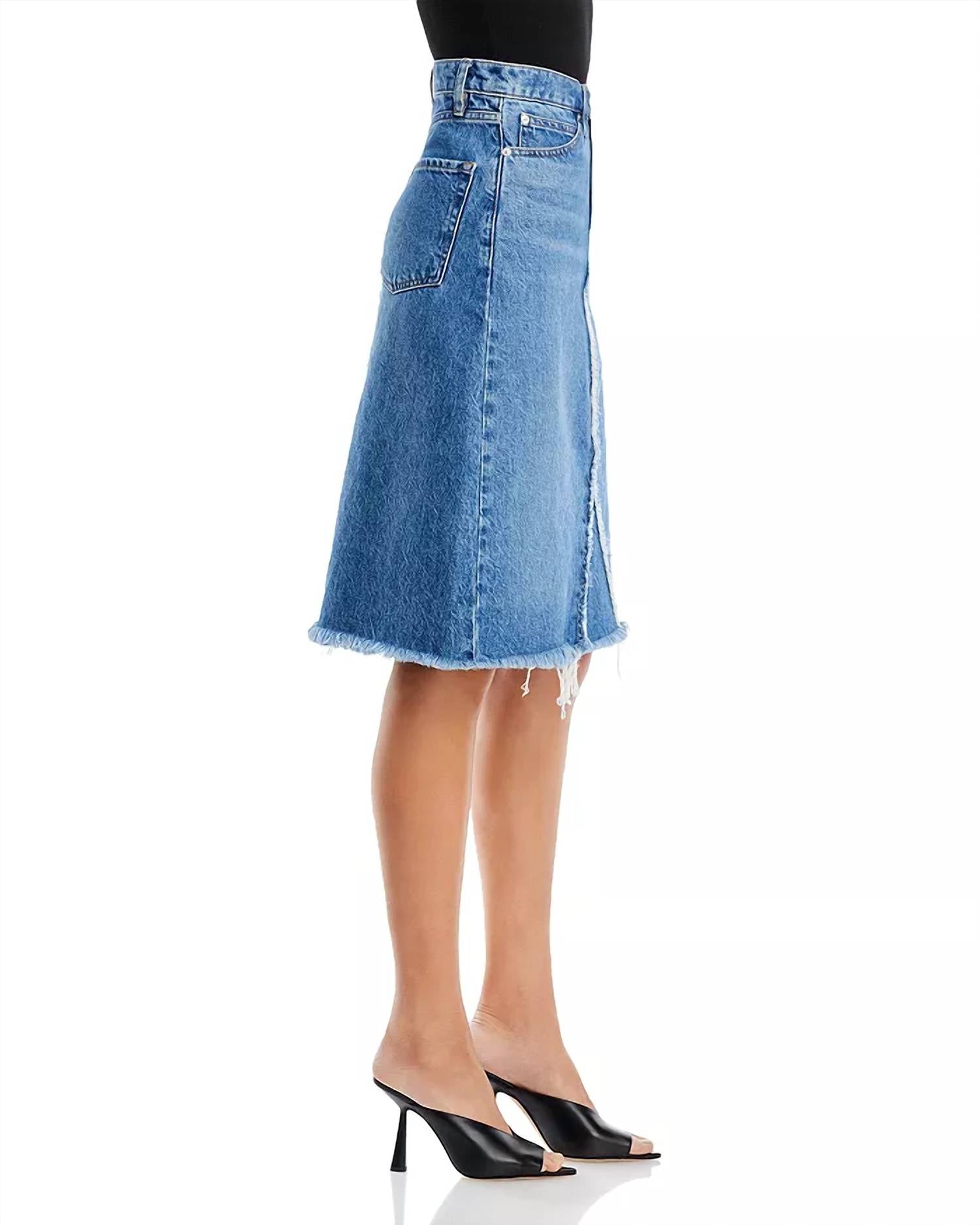 Tuck in your favorite tee for a more laid-back vibe. Meet the Deconstructed Denim Skirt by FRAME, a stylish high-rise midi skirt in a solid blue hue, perfect for a trendy spring wardrobe. Crafted from sustainable cotton denim with recycled materials, it features an asymmetric seam and a frayed hem for a relaxed fit. The skirt includes a functional five-pocket silhouette, zip fly with button closure, and signature contrast stitching with silver-tone hardware. Imported with a length of approximately 23.75 inches and a 46.5-inch sweep, it is conveniently machine washable and suitable for tumble drying. Model is wearing size 26: 5'10" height, 33.5" bust, 23.5" waist, 34.5" hips.