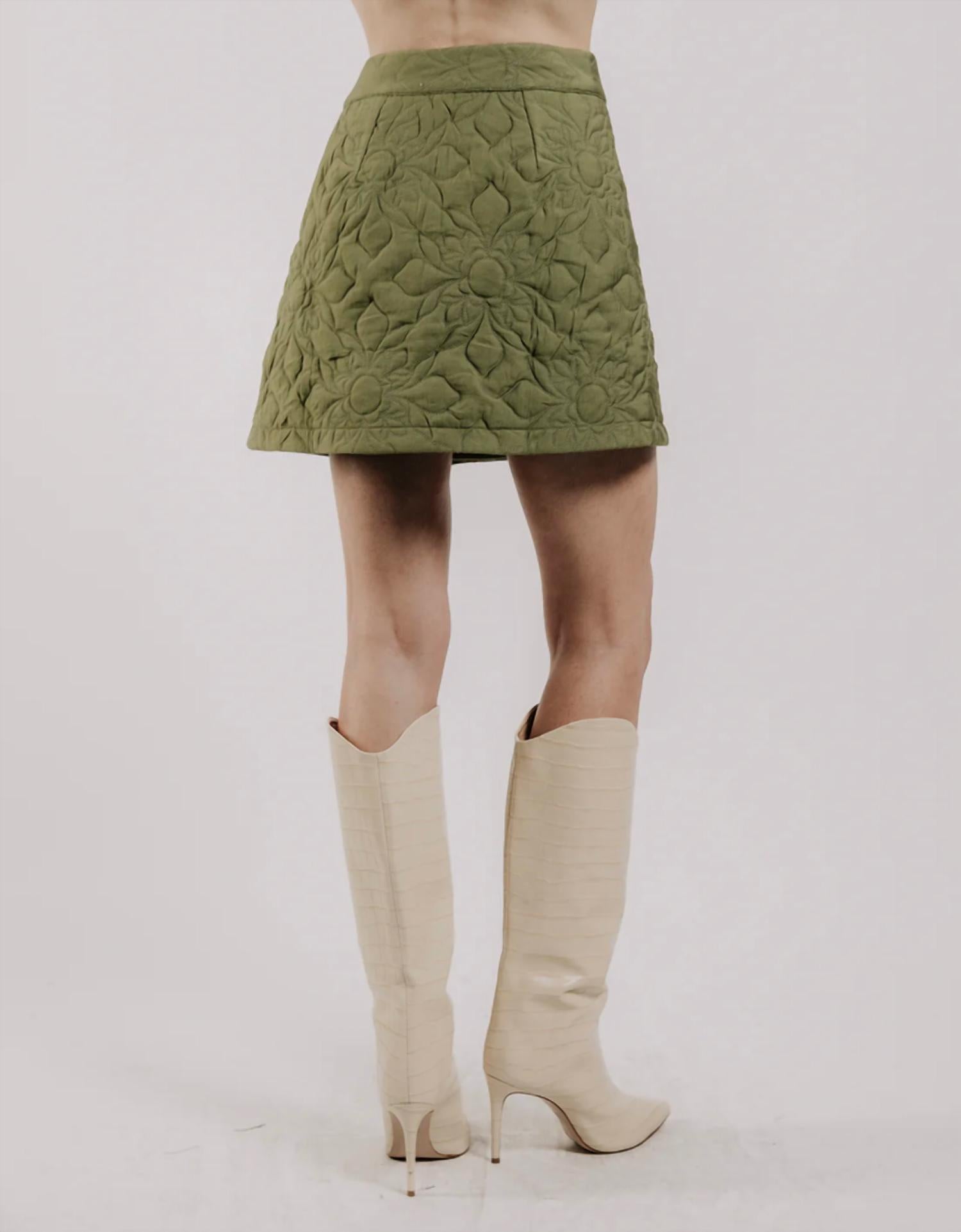 Show just the right amount of leg in this fit flattering mini. Elevate your wardrobe with the LOVE THE LABEL Melanie Quilted Skirt, an A-line silhouette in a sophisticated olive hue. Crafted from a 90% viscose and 10% nylon blend, it features delicate floral stitching on a textured, quilted design. The skirt is completed with a smooth 100% cotton lining for all-day comfort and button closure for ease. Care: Machine wash and tumble dry for convenience.