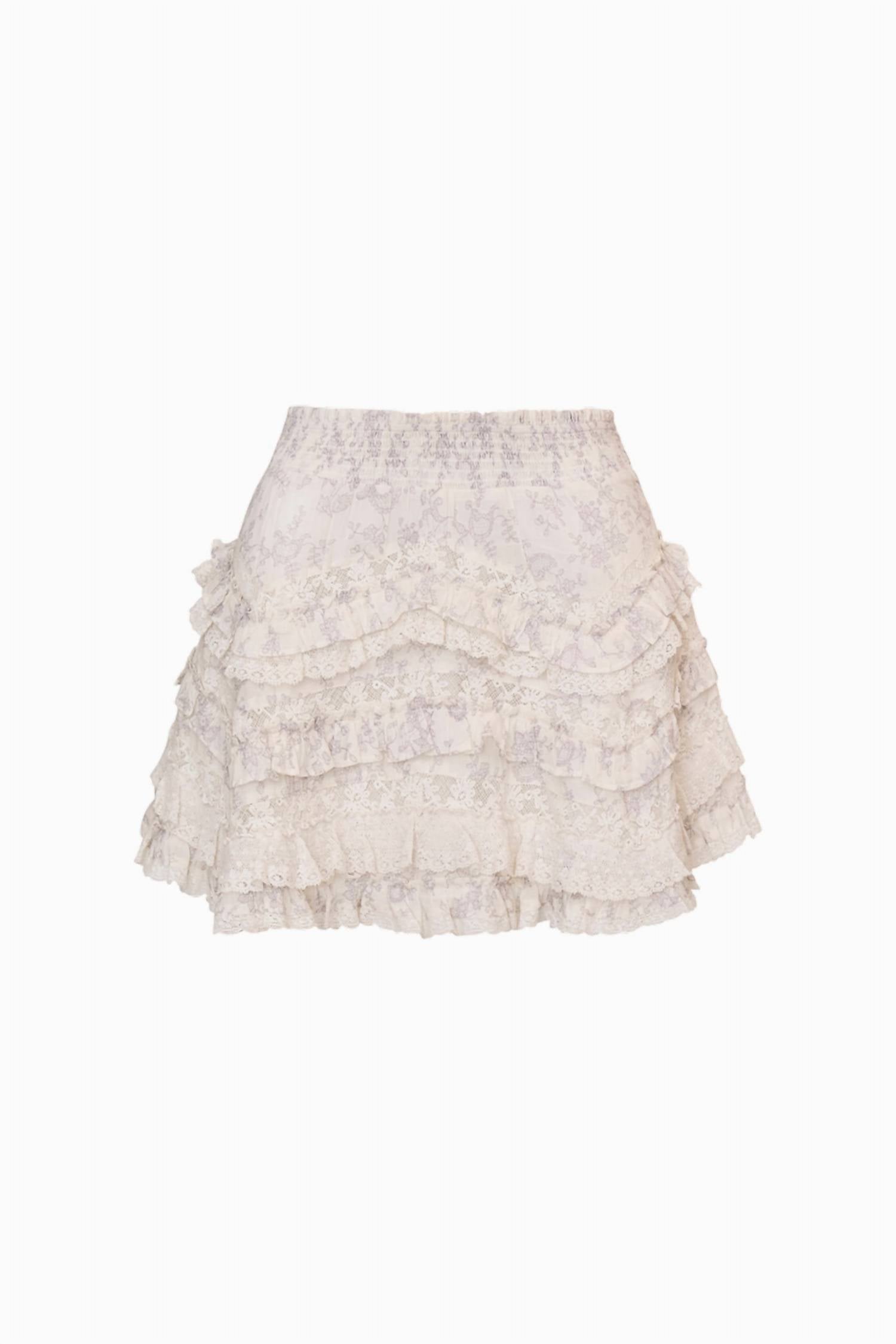 Show just the right amount of leg in this fit flattering mini. Presenting the Serevina Mini Skirt by LoveShackFancy, a romantic addition to your summer wardrobe in a delicate Chantilly floral pattern. This slip silhouette skirt features a fully smocked waistband, offering a pull-on closure for ease and comfort, with layers of lace and ruffle tiers that create a fluttery, handkerchief design. Crafted from 100% organic cotton, it measures 13 3/4" in front length and 26" at the waist, offering gentle movement and feminine flair. Ideal for a boho chic vacation, care for this piece by hand washing in cold water.