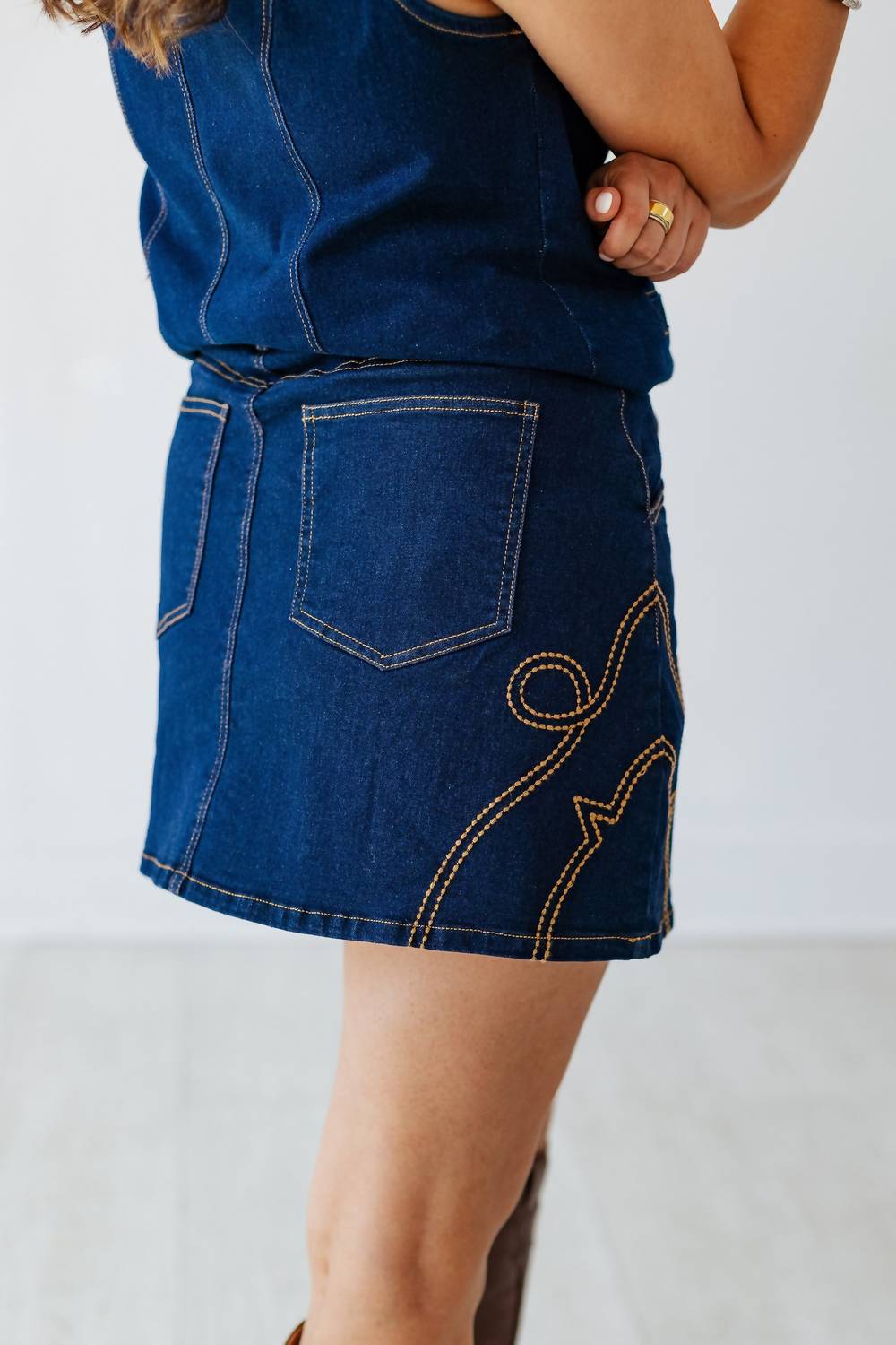 The perfect mini skirt does exist. Bring on the fall vibes with this dark denim skirt, styled with playful western-inspired stitching for a touch of rustic charm. Soft, stretchy, and easy to pair with boots and cozy layers, it’s the perfect piece to carry you through the season with effortless style. Model is 5'3", usually wears a size 2/Small, and is shown in a Small. Runs true to size. 70% cotton, 27% polyester, 3% spandex.