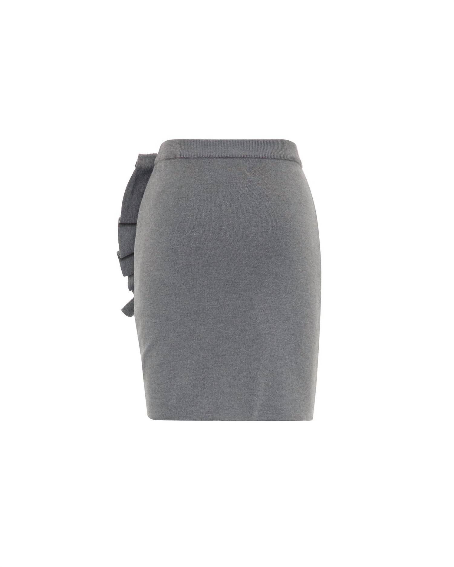 The perfect mini skirt does exist. Step out with elegance in the Heather Grey Nomia Ruffle Knit Skirt by THEO the Label, perfect for holiday parties. This solid mini skirt is made from a sustainable viscose blend, offering a touch of luxury with its fine vegan cashmere yarn. Adorned with delicate hand-embroidered ruffles and a ruched hem, it delivers a feminine, sophisticated silhouette. Care for it with dry cleaning to maintain its pristine appearance.
