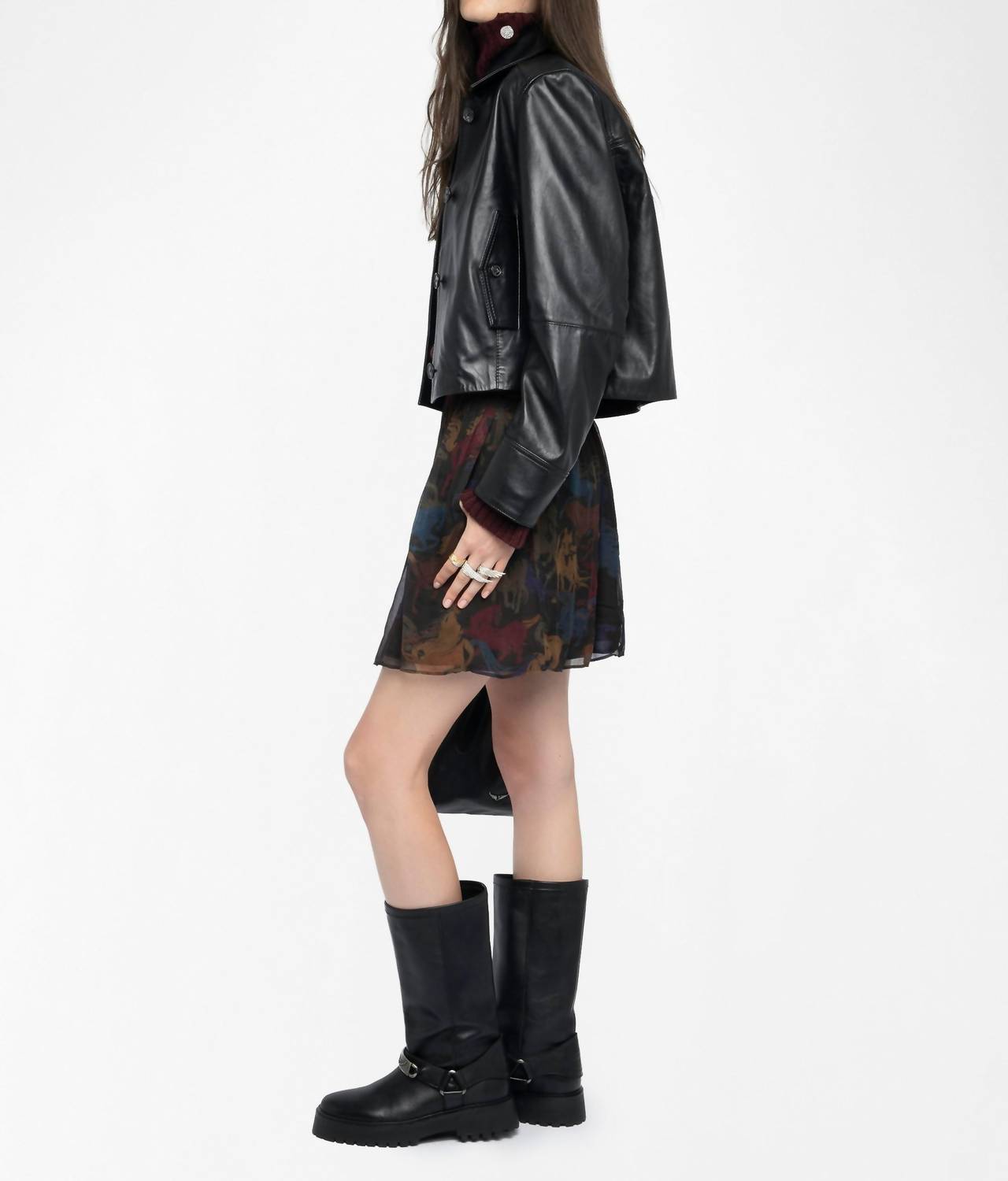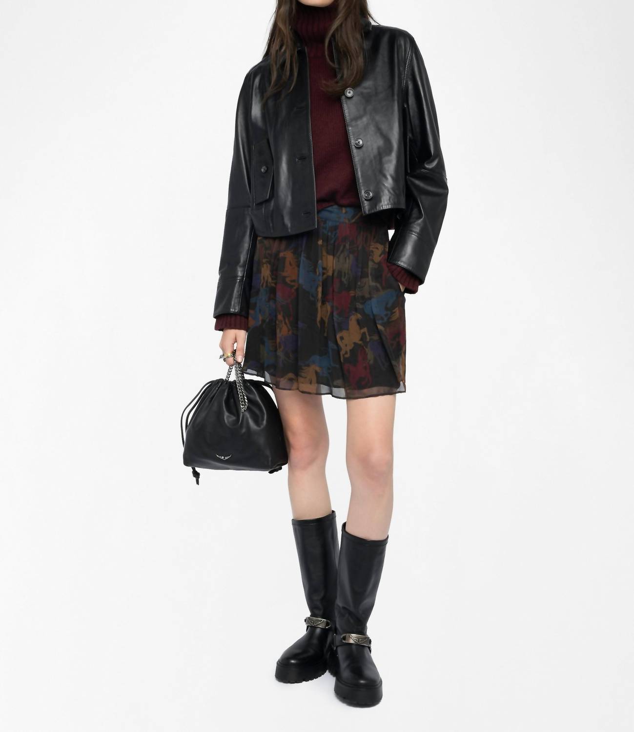 The perfect mini skirt does exist. Experience the playful elegance of the Jadys Horses Skirt by Zadig & Voltaire, perfect for evening events. Crafted from 100% viscose derived from sustainably managed forests, this mini skirt showcases a sheer chiffon horse print in dark chocolate. It features a flattering side slit and a convenient back zip fastening for easy wear. The fully lined, fluid silhouette ensures comfortable elegance, while the model stands 5'10" and wears a size small.