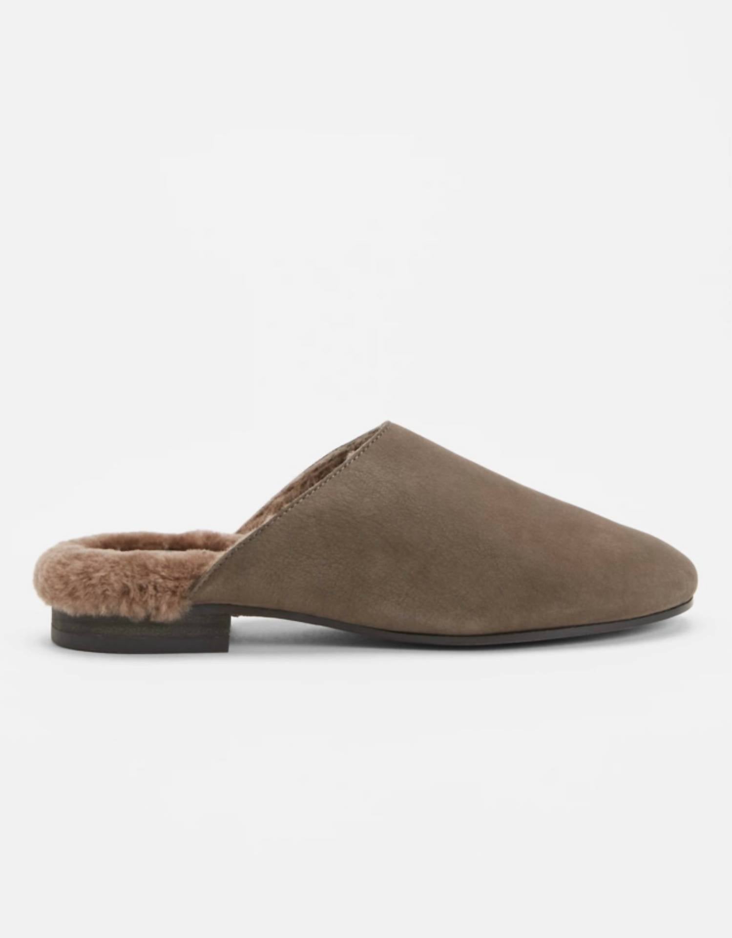 Stylish, comfy, and versatile. We can't find anything wrong with these. Indulge in ultimate comfort with the Gwen Tumbled Nubuck Mule by Eileen Fisher, a perfect addition for your summer wardrobe. Crafted in China, these mules feature a cozy shearling lining, set in luxurious tumbled nubuck leather. With a chic round toe and a flat 0.5-inch heel, these brown mules combine vintage trend with modern appeal. Ideal for adding a touch of warmth and style to any outfit.