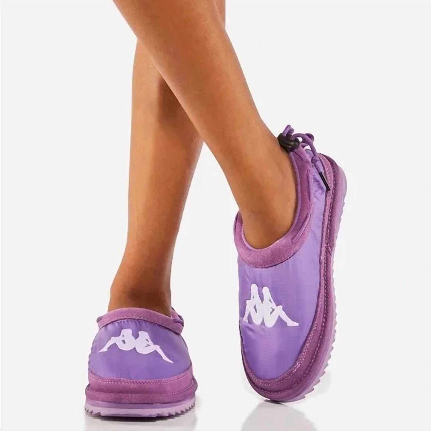 Stylish, comfy, and versatile. We can't find anything wrong with these. Step into comfort with the Kappa Unisex Authentic Mule 3 Slippers, stylishly crafted in a soothing lavender hue. These lowcut slipper mules feature an upper composed of 80% Nylon and 20% Leather with suede inserts, complemented by a durable rubber outsole for everyday wear. Designed with a convenient slip-on closure and adorned with the Omini logo and banda detailing, they offer a blend of sleek design and ease of use. Perfect for adults seeking a versatile shoe option, these mules boast a flat heel and a comfortable round toe shape.