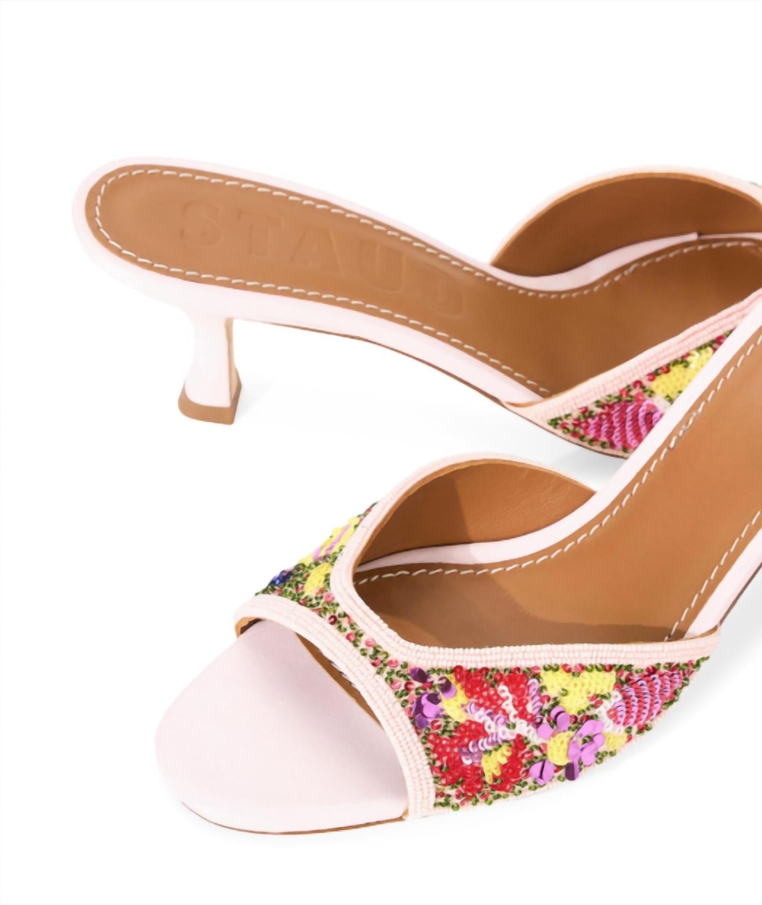 Slip them on and go! Introducing the Women's Brigitte Mule by STAUD, a perfectly versatile piece crafted for stylish spring dressing. These beaded kitten heels in a vibrant wildflower hue are made from a luxurious blend of 72% viscose and 28% silk, with a sturdy sole composed of 95% cow leather and 5% ABS. Originating from Portugal, the mules feature an open-toe design with a mid-height heel measuring 55mm or 2.2 inches, offering an elegant lift. Ideal for wedding occasions and vintage trends, consider sizing up if you find yourself between sizes.