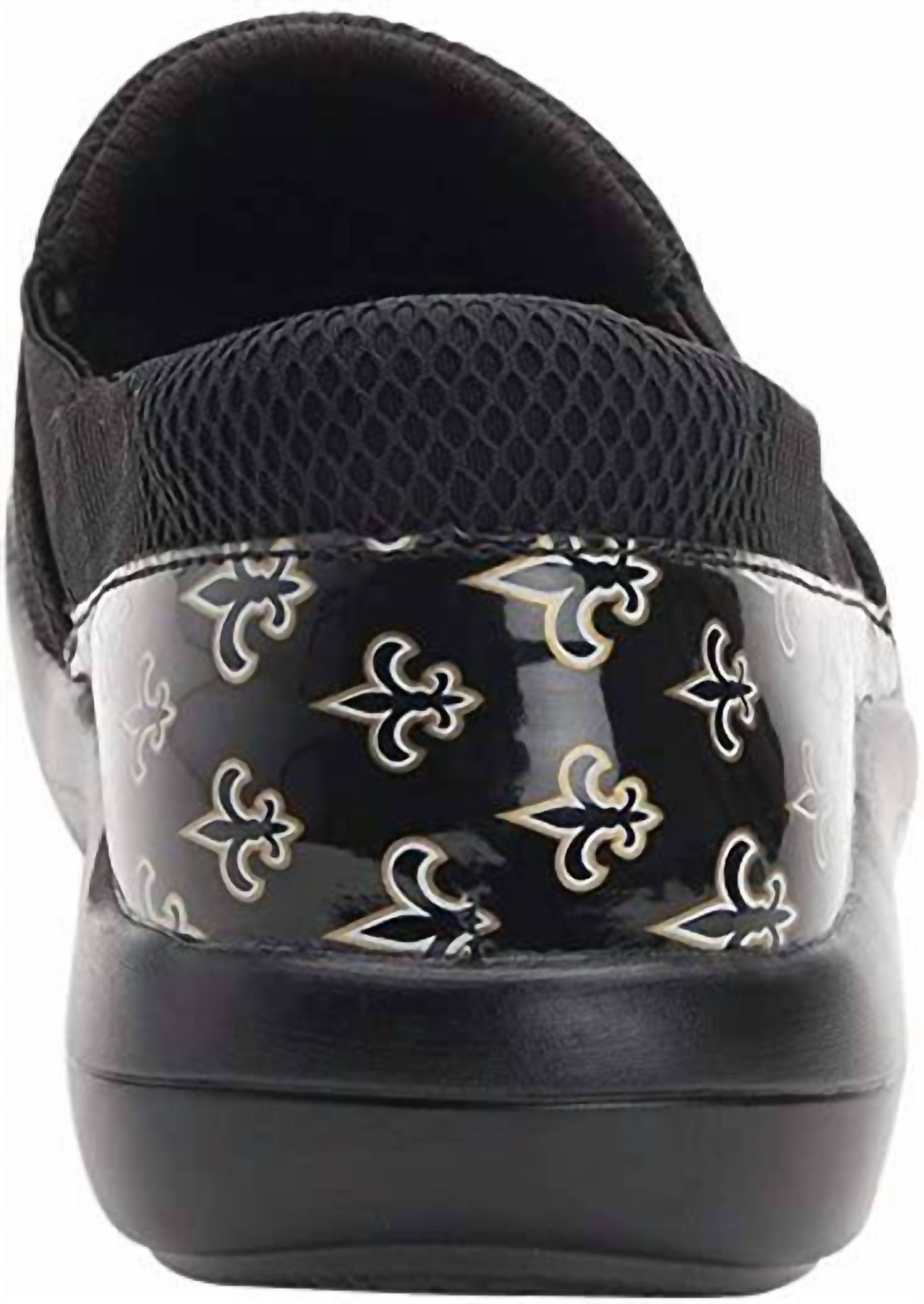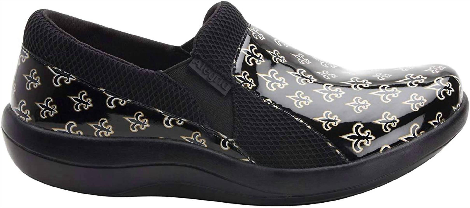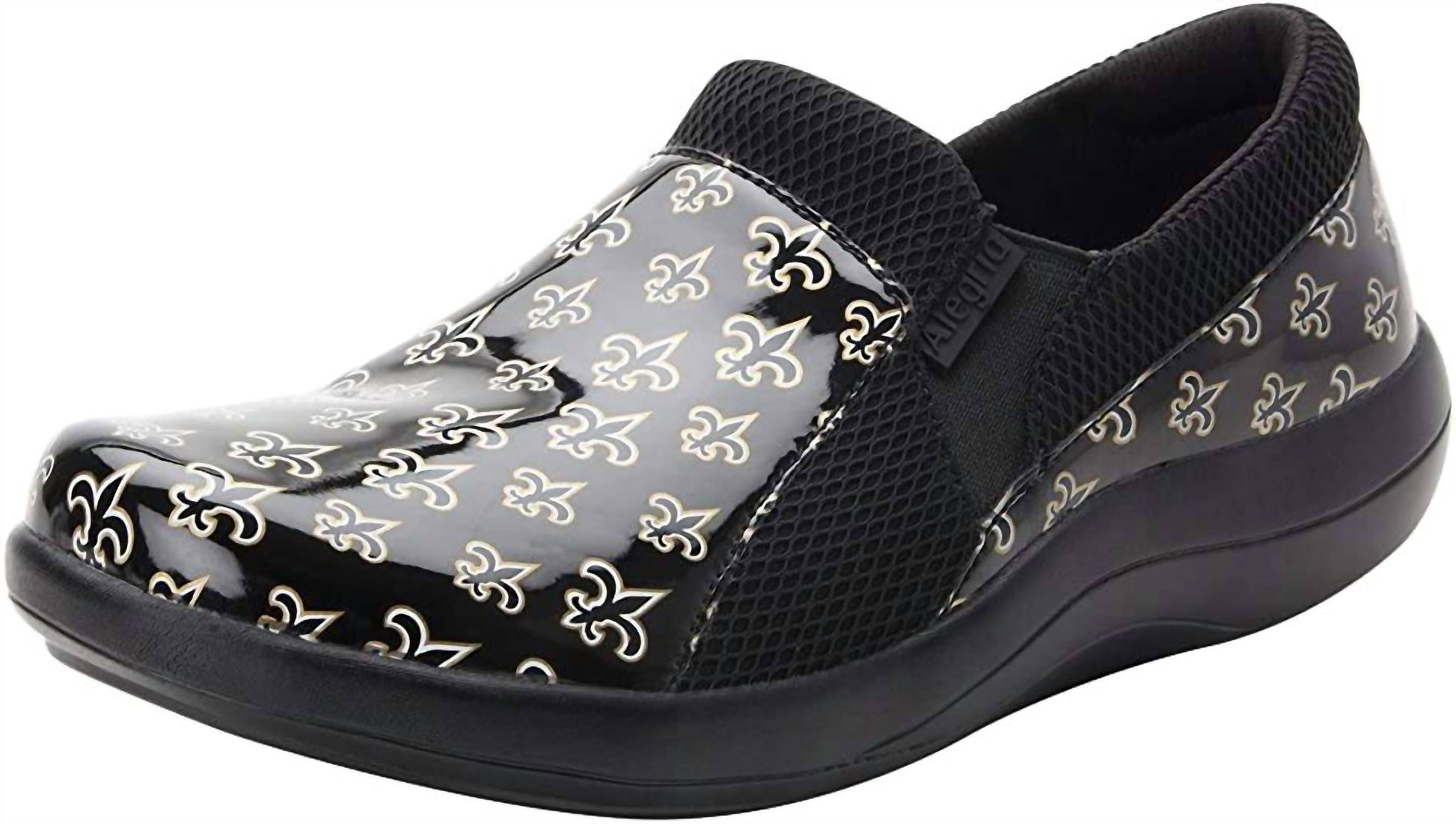 Stylish, comfy, and versatile. We can't find anything wrong with these. Step into comfort with the Women's Duette Shoe by Alegria, a versatile design in Fleur De Lis perfect for on-the-go women. This vegan leather flat features a round toe and double elastic gores for ease and flexibility, complemented by a padded collar for added comfort. Its lightweight and slip-resistant polyurethane outsole is designed for durability, with a subtle 1-inch flat heel. The removable cushioned footbed enhances wearability, making it a must-have for every wardrobe.