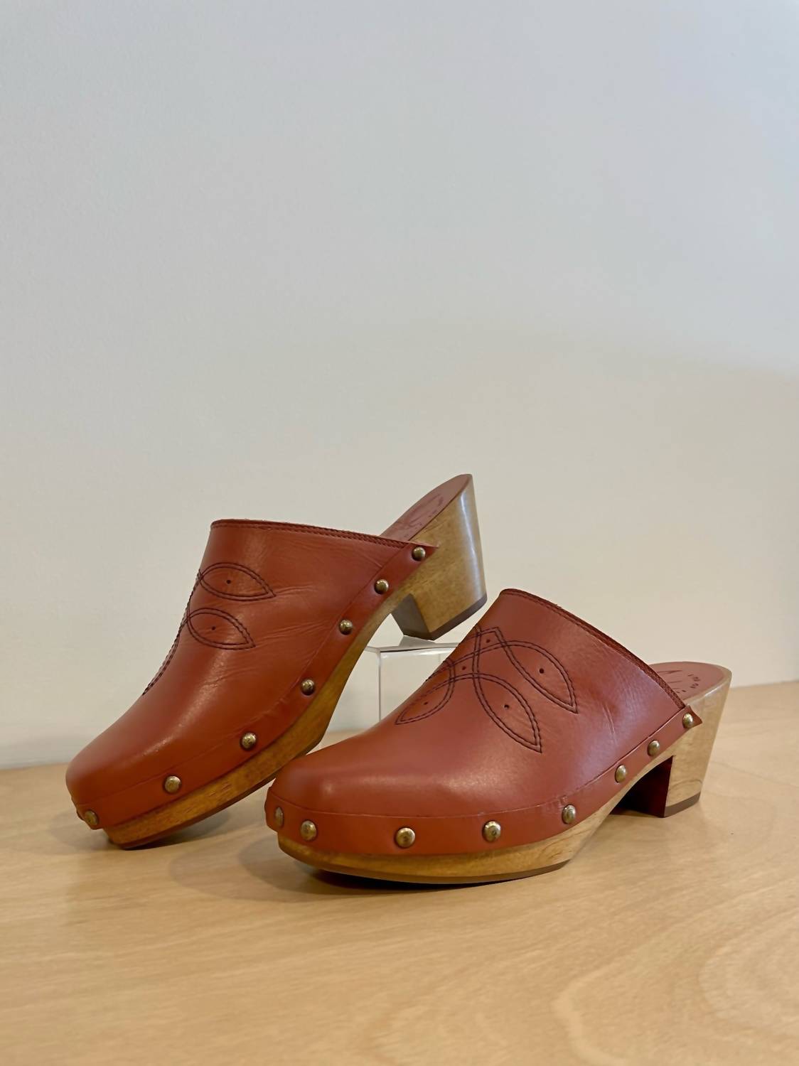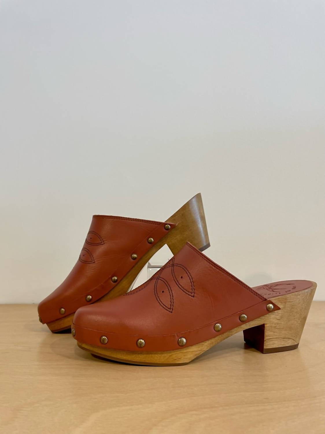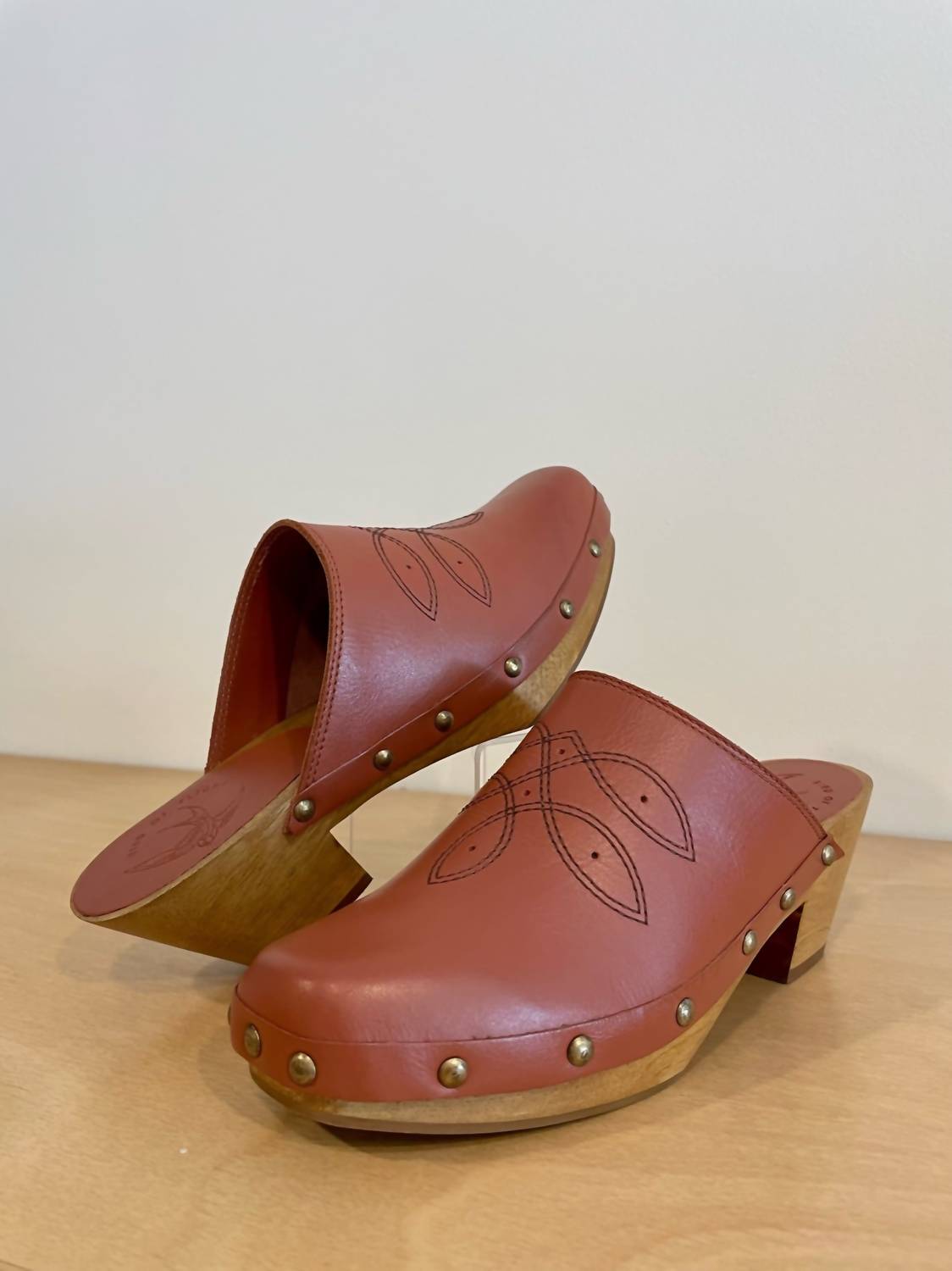 Stylish, comfy, and versatile. We can't find anything wrong with these. Step into style with the Women's Shy Leather Clogs by BIRD OF FLIGHT, crafted from soft vegetable-tanned leather in a chic clay hue. Featuring a distinct square toe and genuine wooden bottom adorned with brass nailhead and Western stitching, these clogs are perfect for any dinner party or summer celebration. With a comfortable block heel height of 6cm (2.3 inches) and a rubber outsole, they fit true to size and offer a soft leather lining for added comfort. Proudly made in Brazil, these vintage-inspired clogs are a must-have for your summer wardrobe.