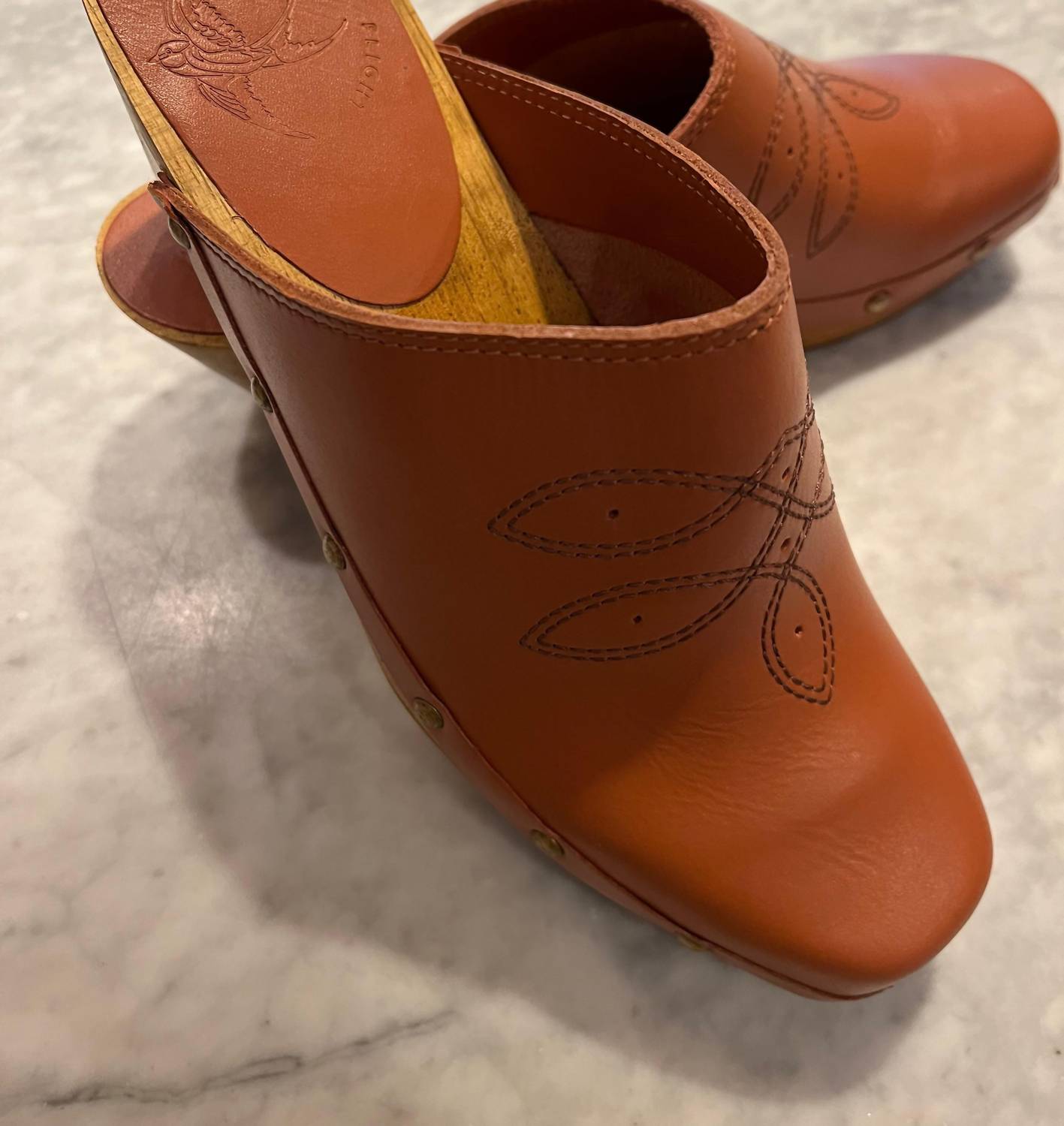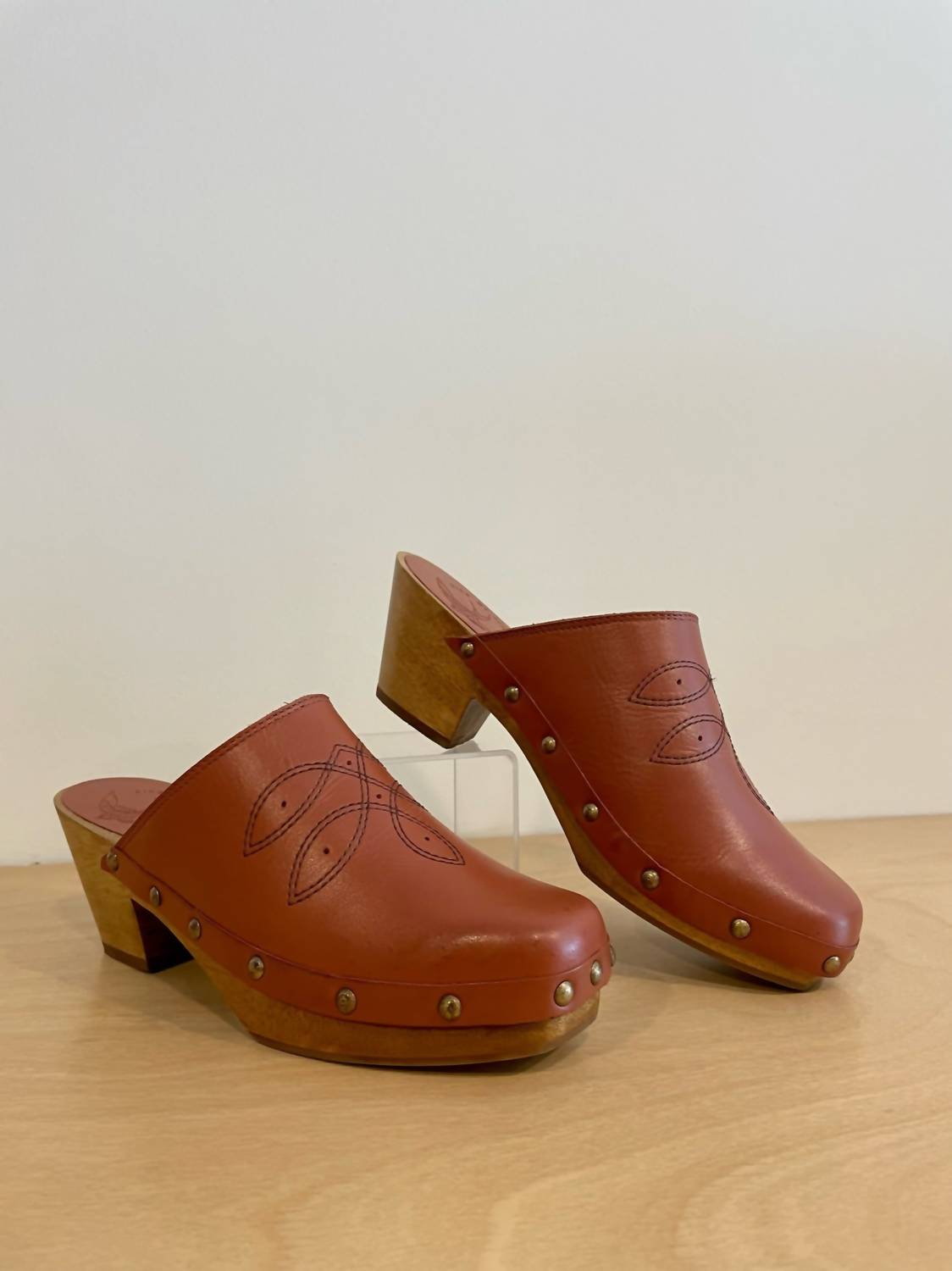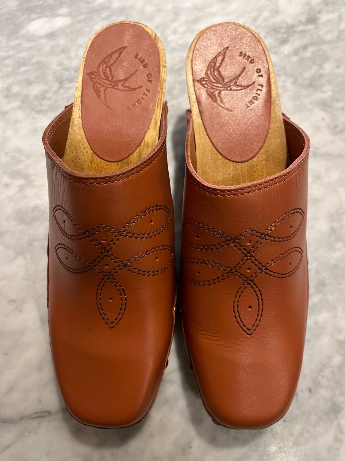 Stylish, comfy, and versatile. We can't find anything wrong with these. Step into style with the Women's Shy Leather Clogs by BIRD OF FLIGHT, crafted from soft vegetable-tanned leather in a chic clay hue. Featuring a distinct square toe and genuine wooden bottom adorned with brass nailhead and Western stitching, these clogs are perfect for any dinner party or summer celebration. With a comfortable block heel height of 6cm (2.3 inches) and a rubber outsole, they fit true to size and offer a soft leather lining for added comfort. Proudly made in Brazil, these vintage-inspired clogs are a must-have for your summer wardrobe.