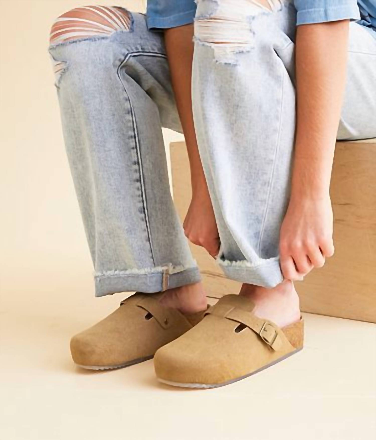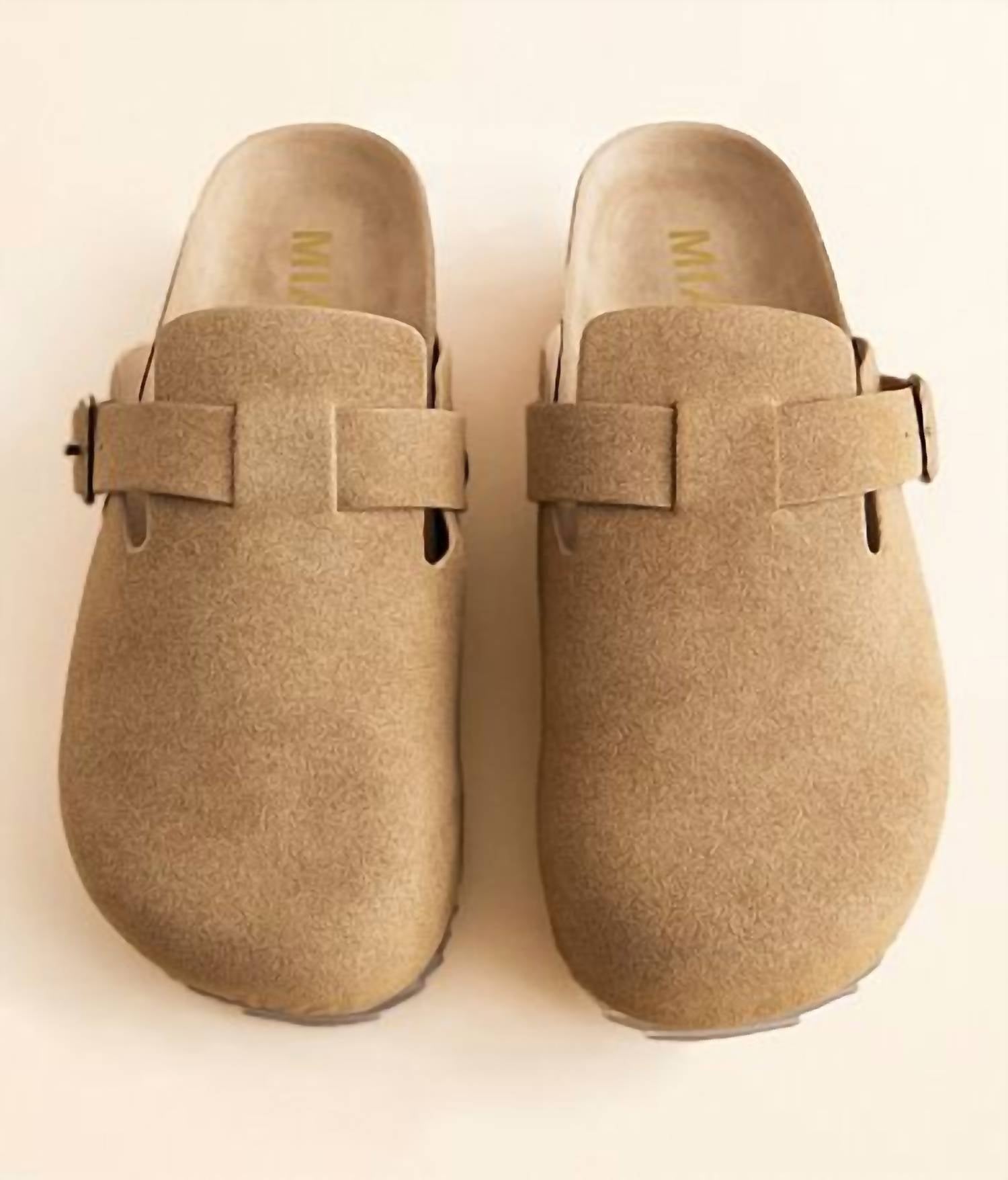 Stylish, comfy, and versatile. We can't find anything wrong with these. Elevate your style with the Women's Mia Qwest Platform Clogs in a chic taupe hue. Featuring a luxe faux leather upper and a sleek buckle detail, these clogs offer a sophisticated yet modern aesthetic. The comfortable slip-on design, round toe, and cushioned footbed ensure all-day ease, complemented by a sturdy 1 7/8" heel. The rubber sole adds durability, making these clogs perfect for pairing with both wide-leg trousers or flowy dresses.