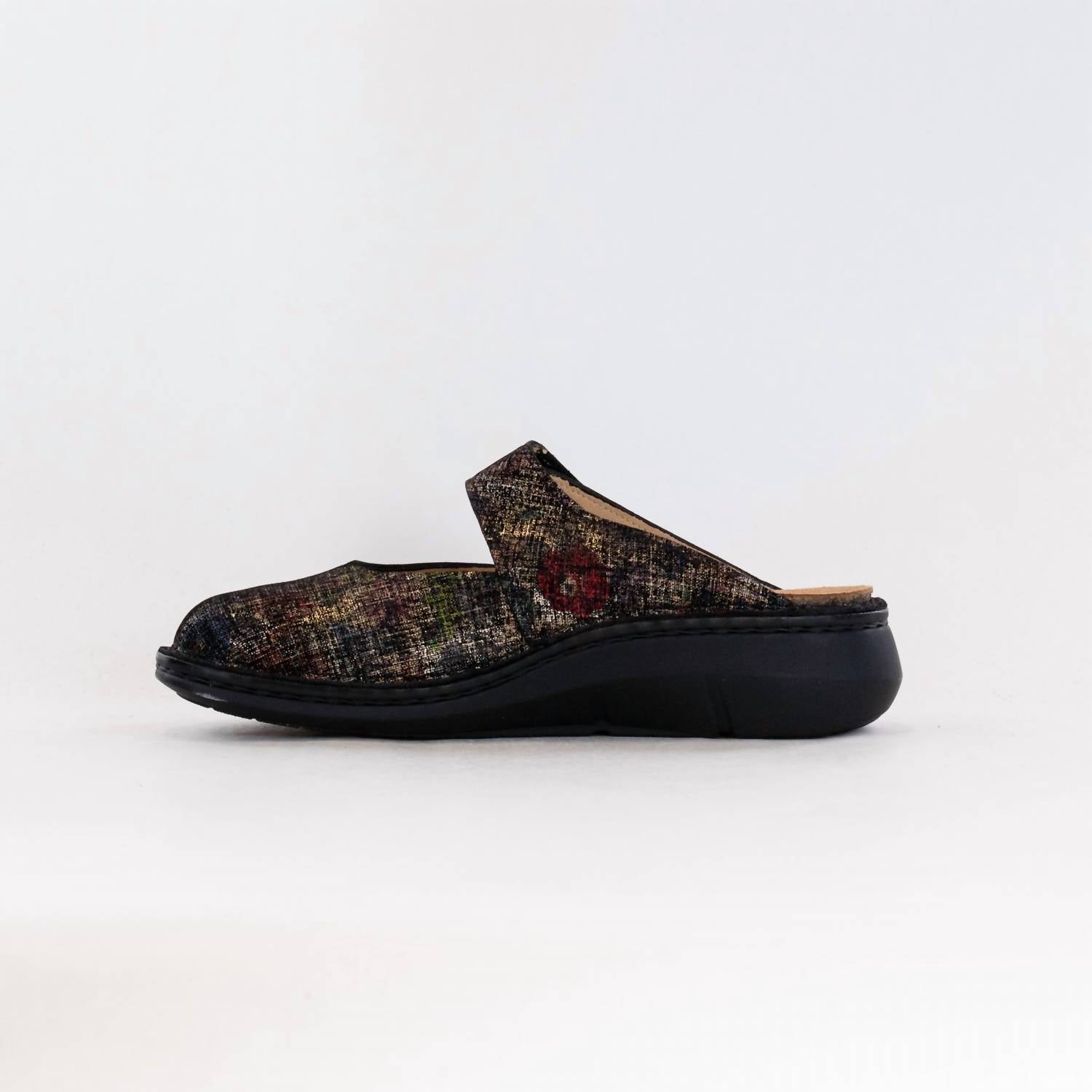 Step into ultimate comfort and style with the Women's Roseau Sandal by Finn Comfort, a classic mule featuring a premium leather upper. This versatile clog in a vibrant Multi Brokat color includes an adjustable hook and loop strap for a customized fit. With a flexible PU outsole that is handstitched to the upper, and a removable footbed made of suede leather, jute, and cork, it promises superior comfort and support. Ideal for streetwear and travel occasions, it boasts a 25mm heel height, offering a standard to wide fit and a round toe shape perfect for spring adventures.