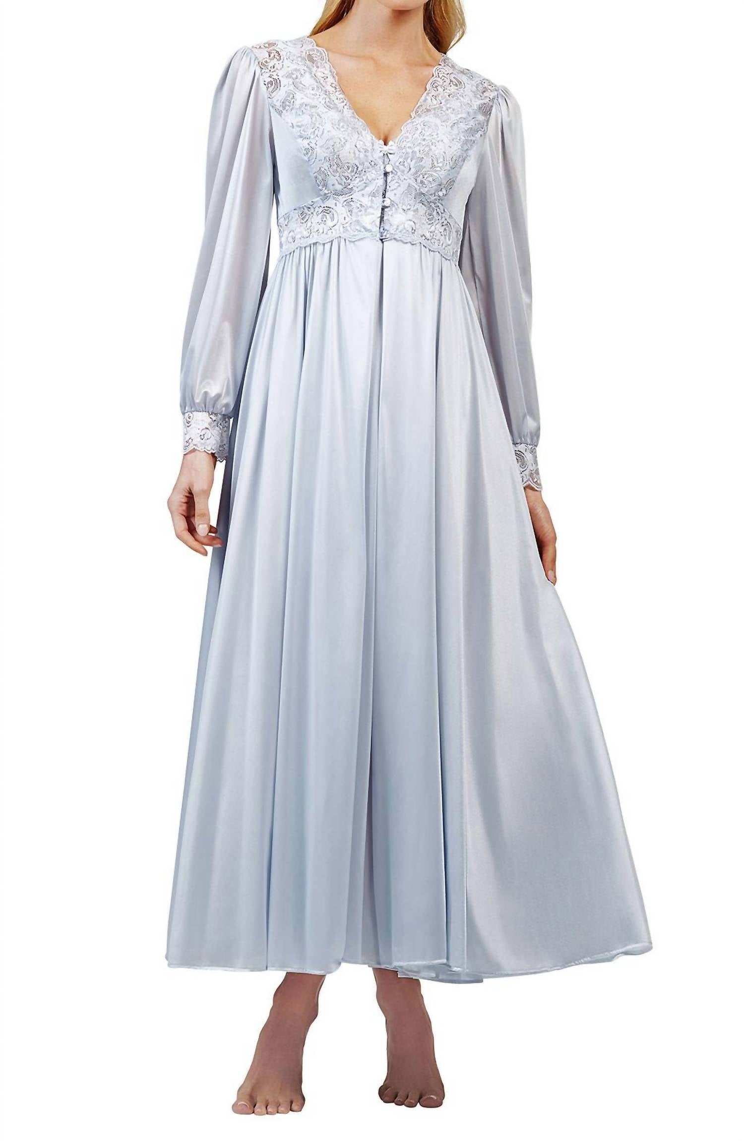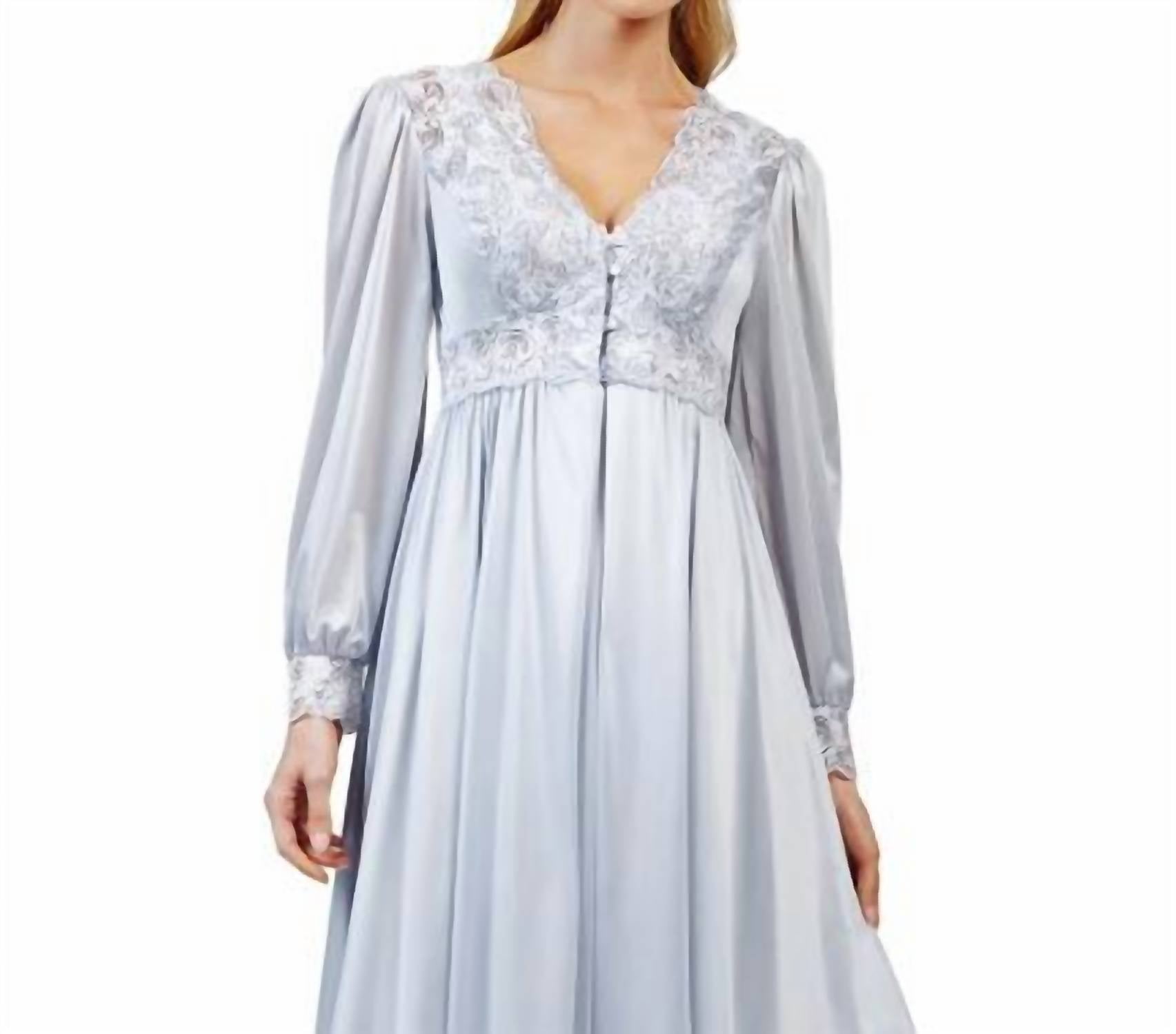 Experience the luxurious comfort of the Silhouette 54" Long Sleeve Long Coat by Shadowline Lingerie, available in an elegant silver hue. This nightgown crafted from 100% nylon tricot features long sleeves with lace cuffs, a lace-embellished bodice, and a scalloped V-neckline. The graceful design includes a gathered skirt and a three-button closure at the front. Origin: Made in the USA and Imported. Care: Machine wash for easy maintenance.